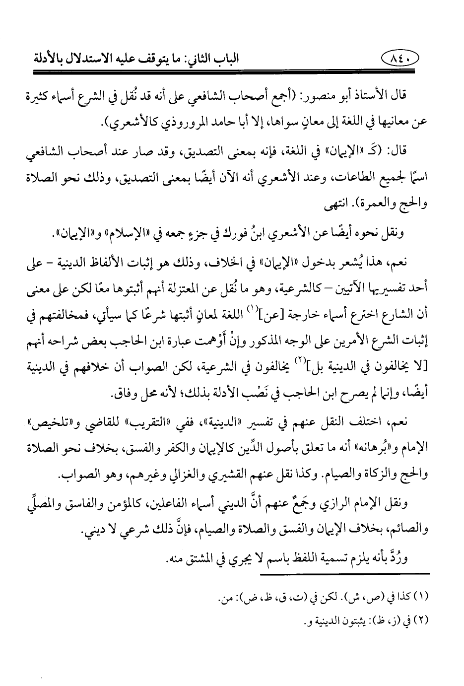 نعم، هذا يُشعر بدخول "الإيمان" في الخلاف، وذلك هو إثبات الألفاظ الدينية - على أحد تفسيريها الآتيين - كالشرعية، وهو ما نُقل عن المعتزلة أنهم أثبتوها مغا لكن على معنى أن الشارع اخترع أسماء خارجة [عن] (¬١) اللغة لمعانٍ أثبتها شرعًا كما سيأتي، فمخالفتهم في إثبات الشرع الأمرين على الوجه المذكور وإنْ أَوْهمت عبارة ابن الحاجب بعض شراحه أنهم [لا يخالفون في الدينية بل] (¬٢) يخالفون في الشرعية، لكن الصواب أن خلافهم في الدينية أيضًا، وإنَّما لم يصرح ابن الحاجب في نَصْب الأدلة بذلك؛ لأنه محل وفاق.