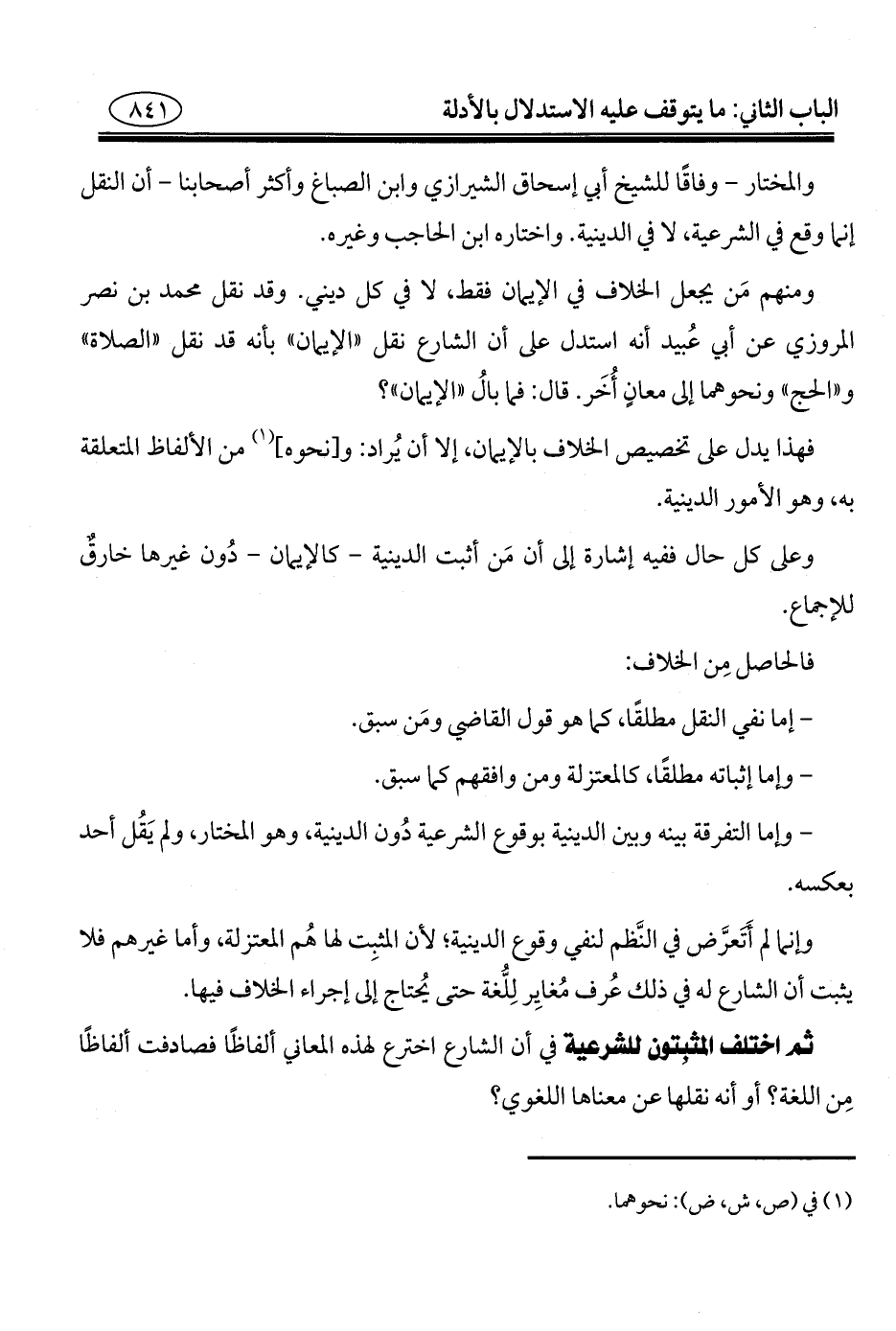 ومنهم مَن يجعل الخلاف في الإيمان فقط، لا في كل ديني. وقد نقل محمد بن نصر المروزي عن أبي عُبيد أنَّه استدل على أن الشارع نقل "الإيمان" بأنه قد نقل "الصلاة" و"الحج" ونحوهما إلى معانٍ أُخَر. قال: فما بالُ "الإيمان"؟