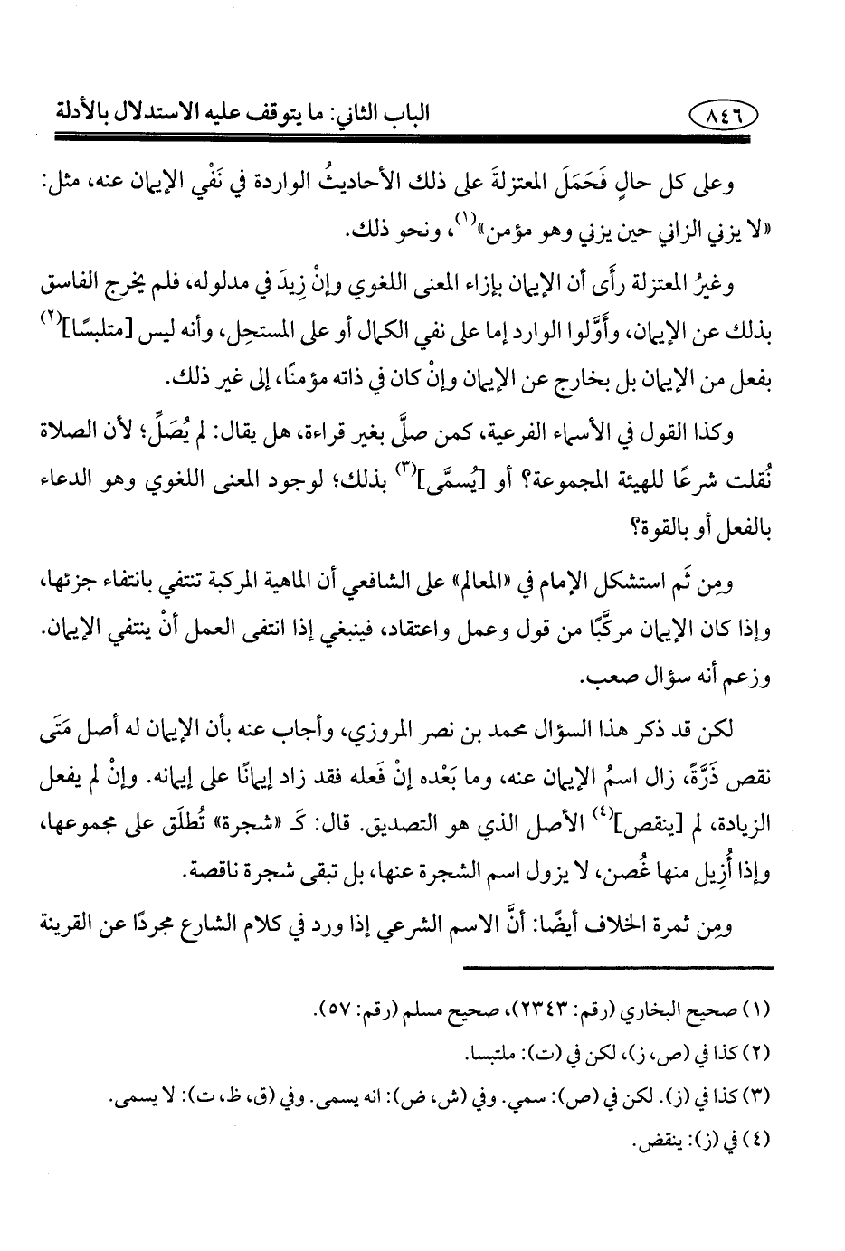 وغيرُ المعتزلة رأَى أن الإيمان بإزاء المعنى اللغوي وإنْ زِيدَ في مدلوله، فلم يخرج الفاسق بذلك عن الإيمان، وأَوَّلوا الوارد إما على نفي الكمال أو على المستحِل، وأنه ليس [متلبسًا] (¬٢) بفعل من الإيمان بل بخارج عن الإيمان وإنْ كان في ذاته مؤمنًا، إلى غير ذلك.