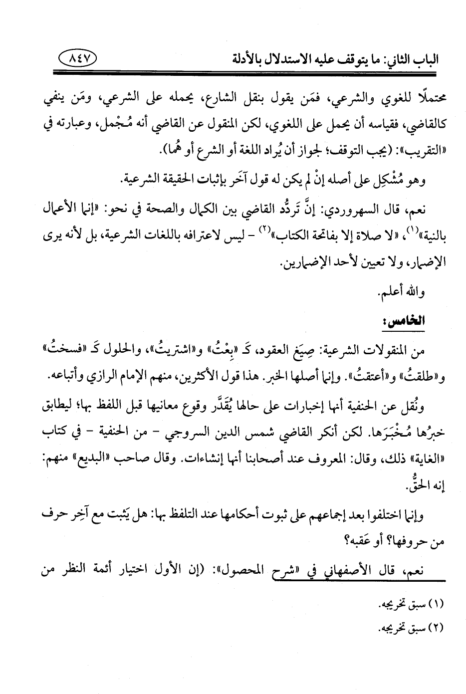 من المنقولات الشرعية: صِيَغ العقود، كَـ "بِعْتُ" و"اشتريتُ"، والحلول كَـ "فسختُ" و"طلقتُ" و"أعتقتُ". وإنَّما أصلها الخبر. هذا قول الأكثرين، منهم الإمام الرازي وأتباعه.