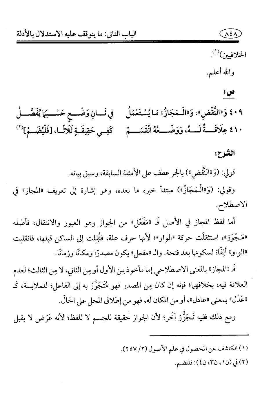 ٤٠٩ - وَ"النَّقْضِ"، وَ"الْمَجَازُ" مَا يُسْتَعْمَلُ ... في ثَانِ وَضْعٍ حَسْبَمًا يُفَصَّلُ