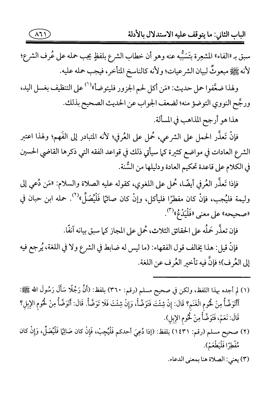 فإذا تَعذَّر العُرفي أيضًا، حُمل على اللغوي، كقوله عليه الصلاة والسلام: "مَن دُعي إلى وليمة فليُجب، فإنْ كان مفطرًا فليأكل، وإنْ كان صائمًا فَلْيُصَلِّ" (¬٢). حمله ابن حبان في "صحيحه" على معنى "فَلْيَدْعُ" (¬٣).