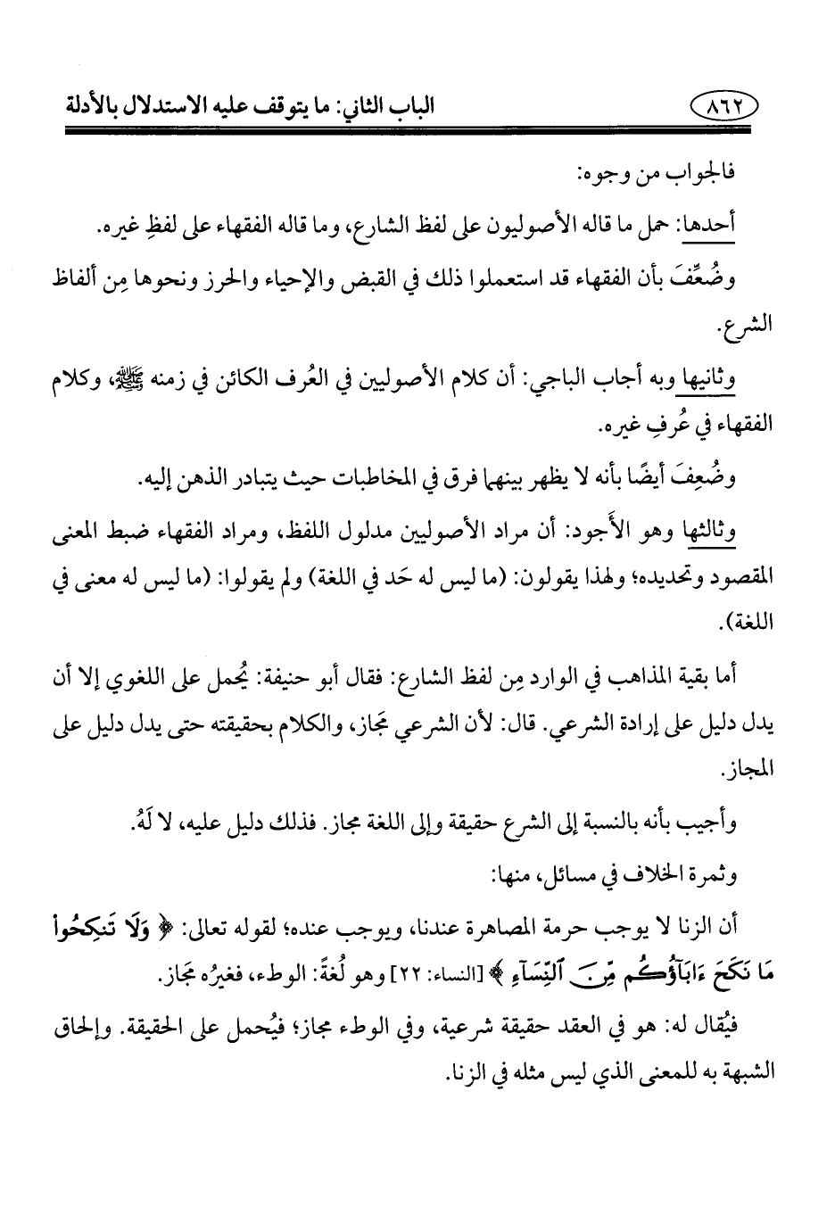 فيُقال له: هو في العقد حقيقة شرعية، وفي الوطء مجاز؛ فيُحمل على الحقيقة. وإلحاق الشبهة به للمعنى الذي ليس مثله في الزنا.