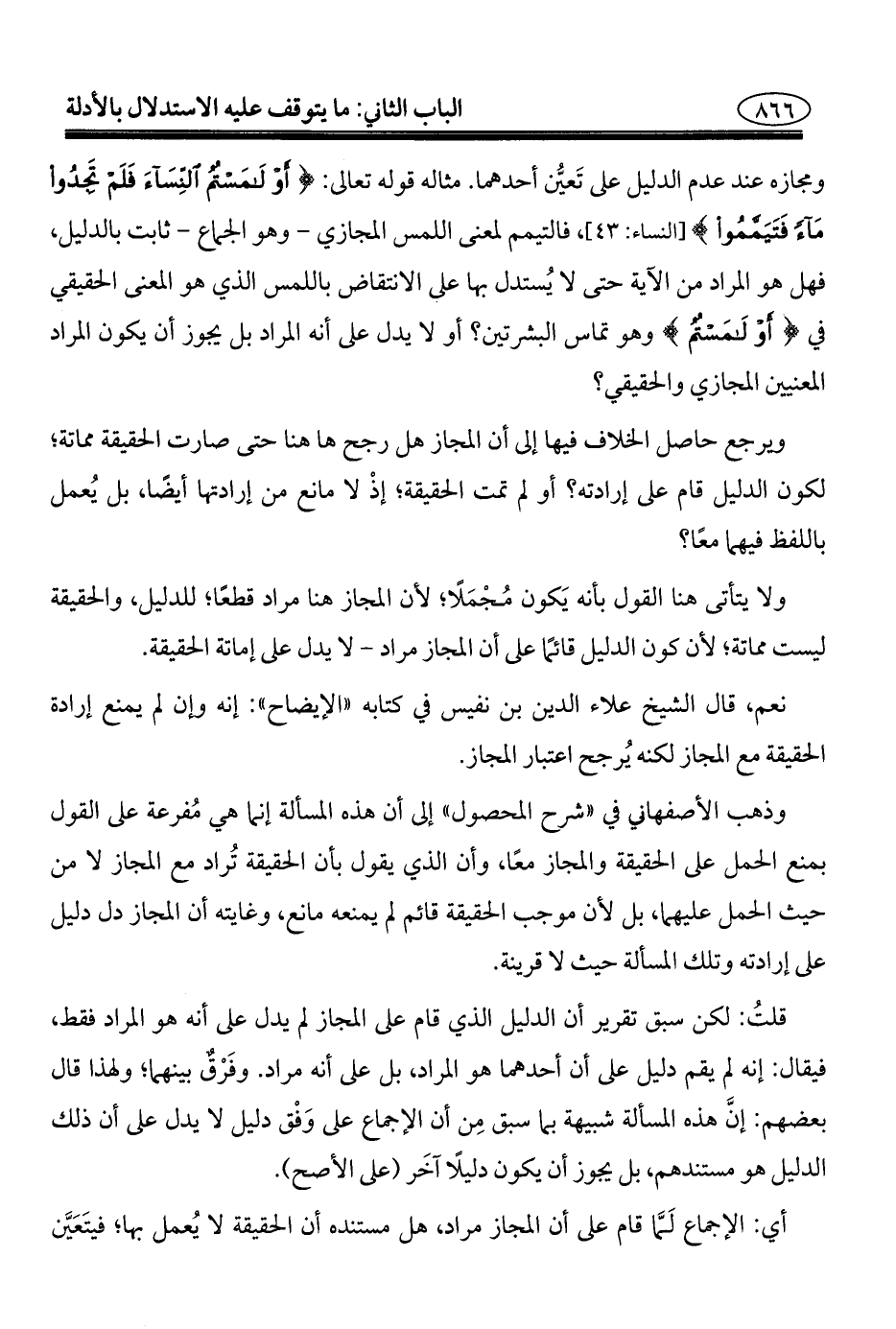 ومجازه عند عدم الدليل على تَعيُّن أحدهما. مثاله قوله تعالى: {أَوْ لَامَسْتُمُ النِّسَاءَ فَلَمْ تَجِدُوا مَاءً فَتَيَمَّمُوا} [النساء: ٤٣]، فالتيمم لمعنى اللمس المجازي -وهو الجماع- ثابت بالدليل، فهل هو المراد من الآية حتى لا يُستدل بها على الانتقاض باللمس الذي هو المعنى الحقيقي في {أَوْ لَامَسْتُمُ} وهو تماس البشرتين؟ أو لا يدل على أنه المراد بل يجوز أن يكون المراد المعنيين المجازي والحقيقي؟