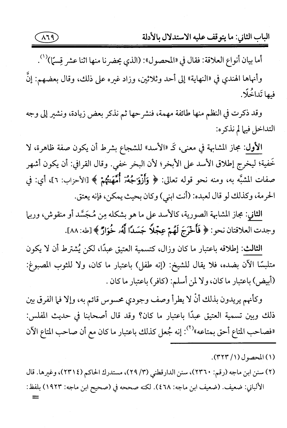 الأول: مجاز المشابهة في معنى، كَـ "الأسد" للشجاع بشرط أن يكون صفة ظاهرة، لا خَفية؛ ليخرج إطلاق الأسد على الأبخر؛ لأن البخر خفي. وقال القرافي: أن يكون أشهر صفات المشبَّه به، ومنه نحو قوله تعالى: {وَأَزْوَاجُهُ أُمَّهَاتُهُمْ} [الأحزاب: ٦]، أي: في الحرمة، وكذلك لو قال لعبده: (أنت ابني) وكان بحيث يمكن، فإنه يعتق.