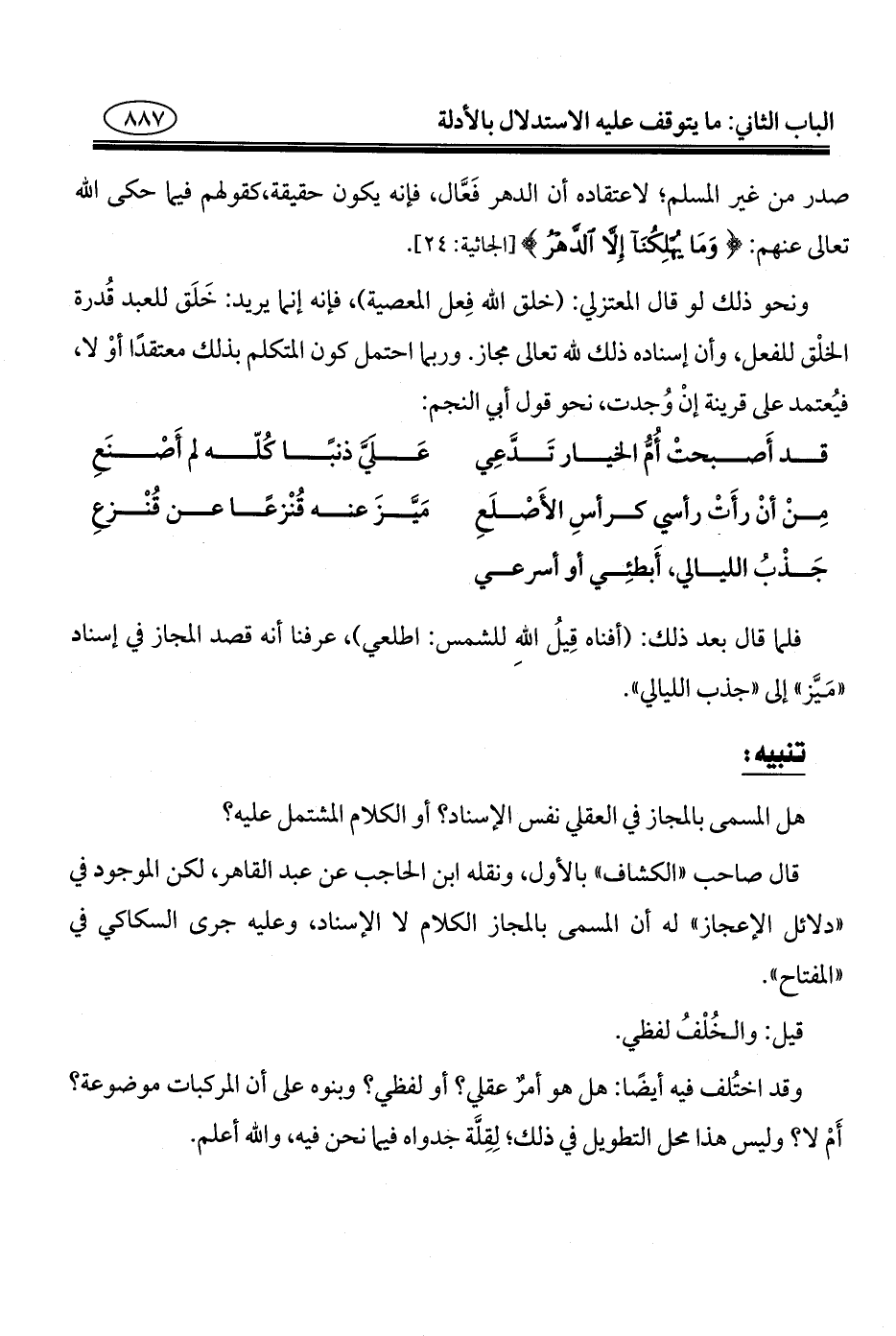 ونحو ذلك لو قال المعتزلي: (خلق الله فِعل المعصية)، فإنه إنما يريد: خَلَق للعبد قُدرة الخلْق للفعل، وأن إسناده ذلك لله تعالى مجاز. وربما احتمل كون المتكلم بذلك معتقدًا أوْ لا، فيُعتمد على قرينة إنْ وُجدت، نحو قول أبي النجم: