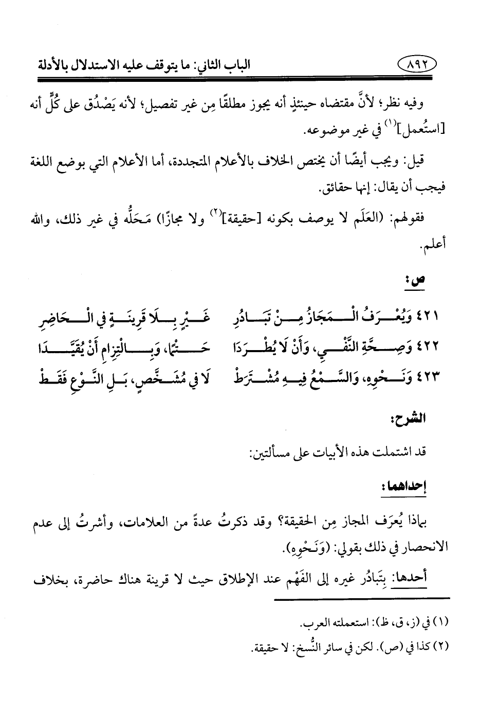 بماذا يُعرَف المجاز مِن الحقيقة؟ وقد ذكرتُ عدةً من العلامات، وأشرتُ إلى عدم الانحصار في ذلك بقولي: (وَنَحْوِهِ).