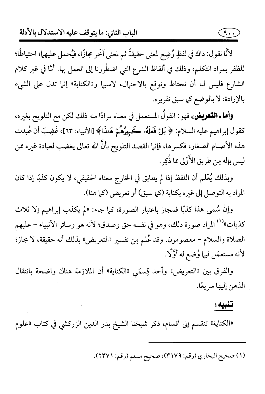 وأما "التعريض" فهو: القولُ المستعمل في معناه مرادًا منه ذلك لكن مع التلويح بغيره، كقول إبراهيم عليه السلام: {بَلْ فَعَلَهُ كَبِيرُهُمْ هَذَا} [الأنبياء: ٦٣]، غَضِبَ أن عُبدت هذه الأصنام الصغار، فكسرها، فإنما القصد التلويح بأنَّ الله تعالى يغضب لعبادة غيره ممن ليس بإله مِن طريق الأَوْلى مما ذُكِر.