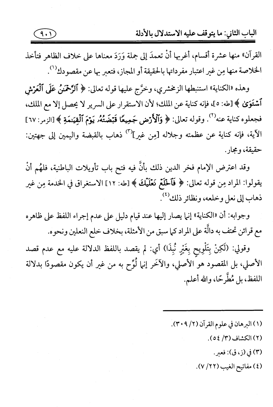 وقد اعترض الإمام فخر الدين ذلك بأنَّ فيه فتح باب تأويلات الباطنية، فلهُم أنْ يقولوا: المراد مِن قوله تعالى: {فَاخْلَعْ نَعْلَيْكَ} [طه: ١٢] الاستغراق في الخدمة مِن غير ذهاب إلى نعل وخلعه، ونظائر ذلك (¬٤).