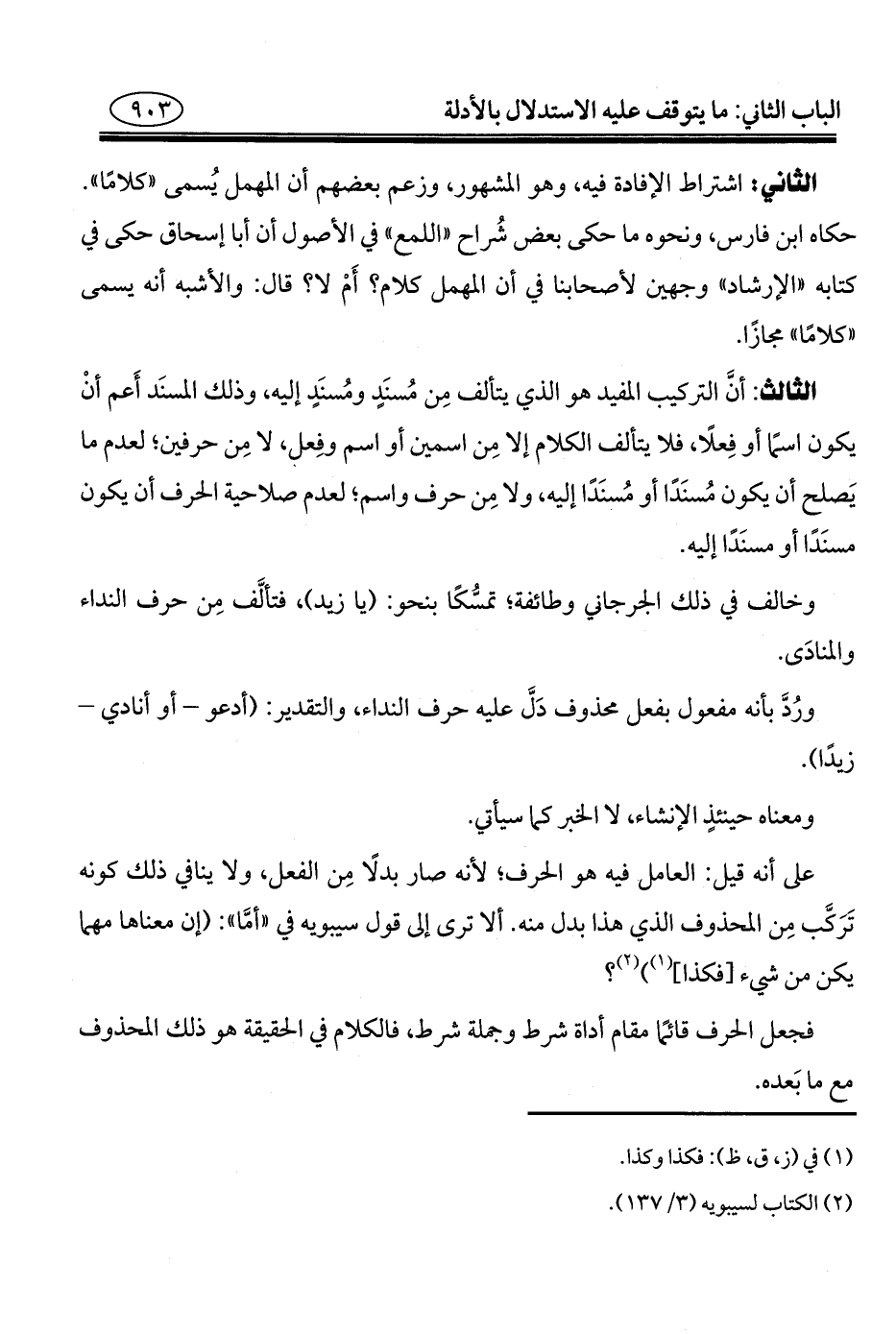 الثاني: اشتراط الإفادة فيه، وهو المشهور، وزعم بعضهم أن المهمل يُسمى "كلامًا". حكاه ابن فارس، ونحوه ما حكى بعض شُراح "اللمع" في الأصول أن أبا إسحاق حكى في كتابه "الإرشاد" وجهين لأصحابنا في أن المهمل كلام؛ أَمْ لا؟ قال: والأشبه أنه يسمى "كلامًا" مجازًا.