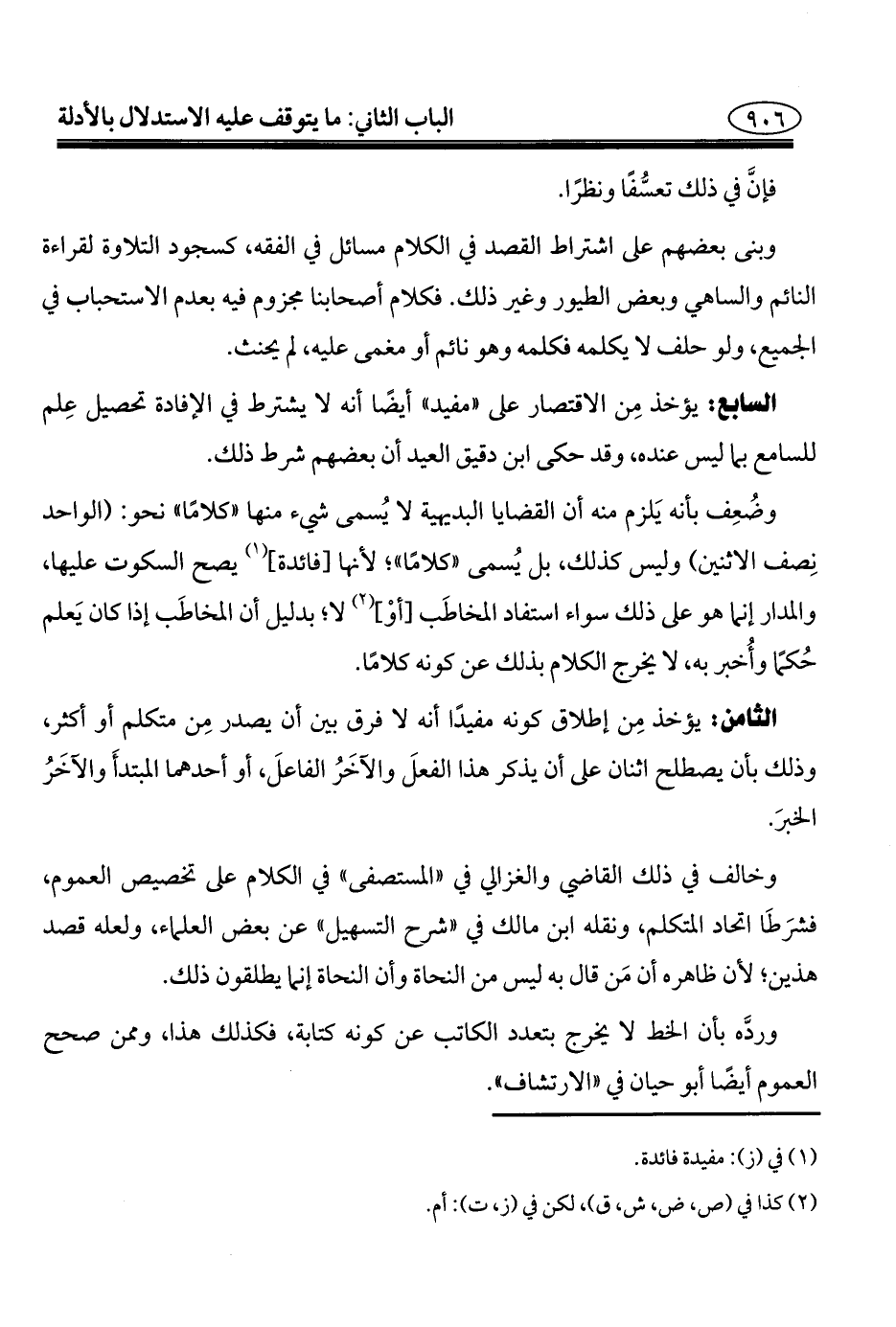 الثامن: يؤخذ مِن إطلاق كونه مفيدًا أنه لا فرق بين أن يصدر مِن متكلم أو أكثر، وذلك بأن يصطلح اثنان على أن يذكر هذا الفعلَ والآخَرُ الفاعلَ، أو أحدهما المبتدأَ والآخَرُ الخبرَ.