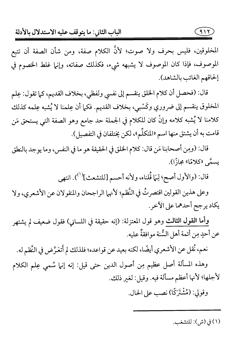 المخلوقين، فليس بحرف ولا صوت؛ لأنَّ الكلام صفة، ومن شأن الصفة أن تتبع الموصوف، فإذا كان الموصوف لا يشبهه شيء، فكذلك صفاته، وإنما غلط الخصوم في إلحاقهم الغائب بالشاهد).