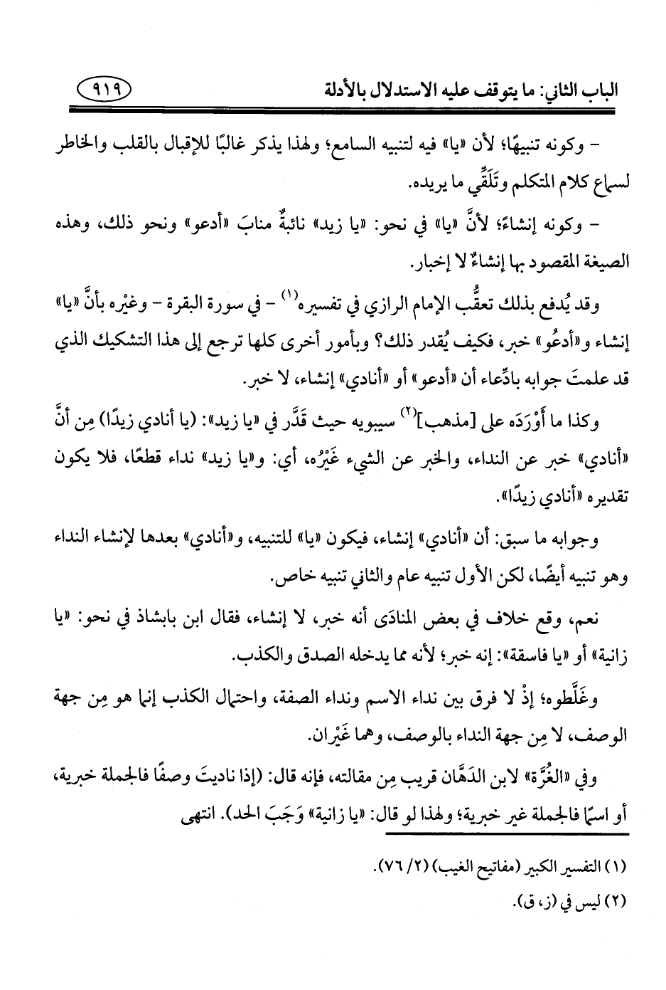 وقد يُدفع بذلك تعقُّب الإمام الرازي في تفسيره (¬١) -في سورة البقرة- وغيْره بأنَّ "يا" إنشاء و"أدعُو" خبر، فكيف يُقدر ذلك؟ وبأمور أخرى كلها ترجع إلى هذا التشكيك الذي قد علمتَ جوابه بادِّعاء أن "أدعو" أو "أنادي" إنشاء، لا خبر.