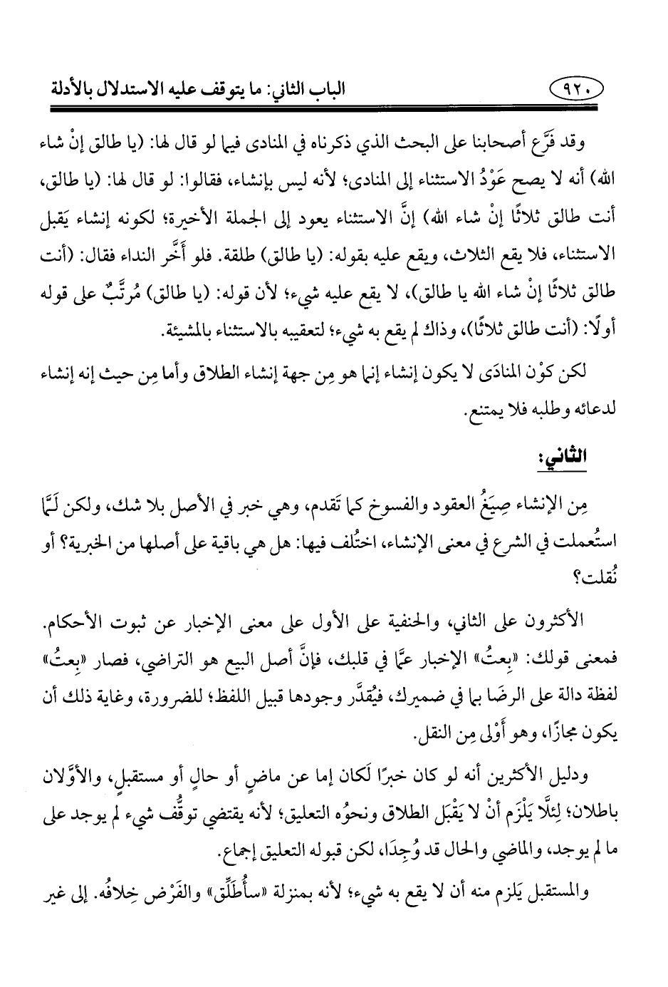 وقد فرَّع أصحابنا على البحث الذي ذكرناه في المنادى فيما لو قال لها: (يا طالق إنْ شاء الله) أنه لا يصح عَوْدُ الاستثناء إلى المنادى؛ لأنه ليس بإنشاء، فقالوا: لو قال لها: (يا طالق، أنت طالق ثلاثًا إنْ شاء الله) إنَّ الاستثناء يعود إلى الجملة الأخيرة؛ لكونه إنشاء يَقبل الاستثناء، فلا يقع الثلاث، ويقع عليه بقوله: (يا طالق) طلقة. فلو أَخَّر النداء فقال: (أنت طالق ثلاثًا إنْ شاء الله يا طالق)، لا يقع عليه شيء؛ لأن قوله: (يا طالق) مُرتَّبٌ على قوله أولًا: (أنت طالق ثلاثًا)، وذاك لم يقع به شيء، لتعقيبه بالاستثناء بالمشيئة.