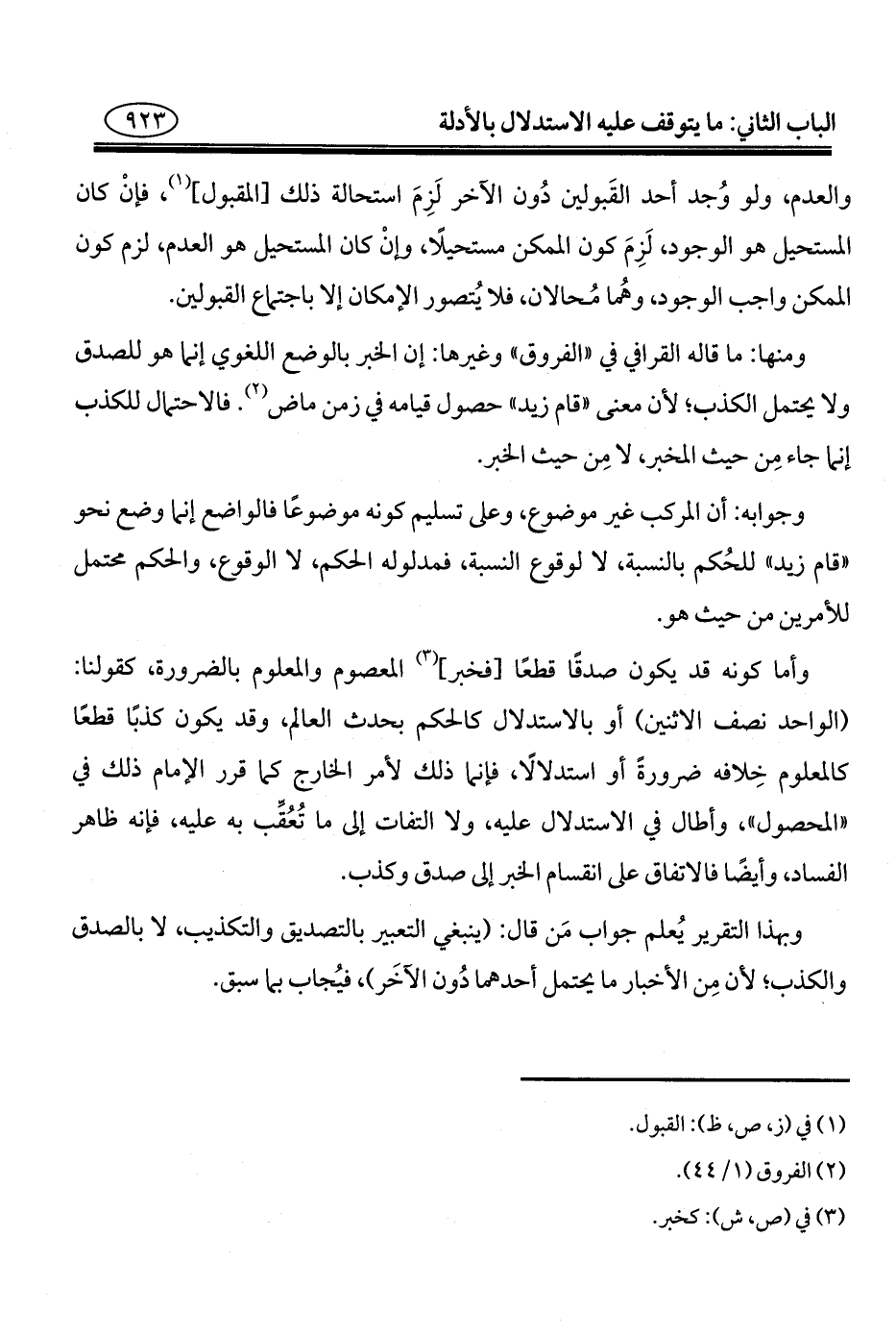 ومنها: ما قاله القرافي في "الفروق" وغيرها: إن الخبر بالوضع اللغوي إنما هو للصدق ولا يحتمل الكذب؛ لأن معنى "قام زيد" حصول قيامه في زمن ماض (¬٢). فالاحتمال للكذب إنما جاء مِن حيث المخبر، لا مِن حيث الخبر.
