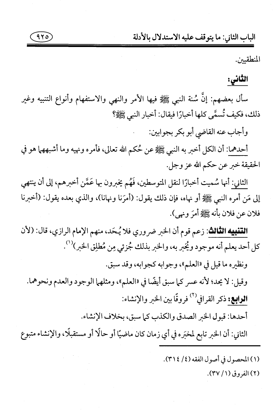 التنبيه الثالث: زعم قوم أن الخبر ضروري فلا يُحَد، منهم الإمام الرازي، قال: (لأن كل أحد يعلم أنه موجود ويُخبر به، والخبر بذلك جُزئي مِن مُطلِق الخبر) (¬١).