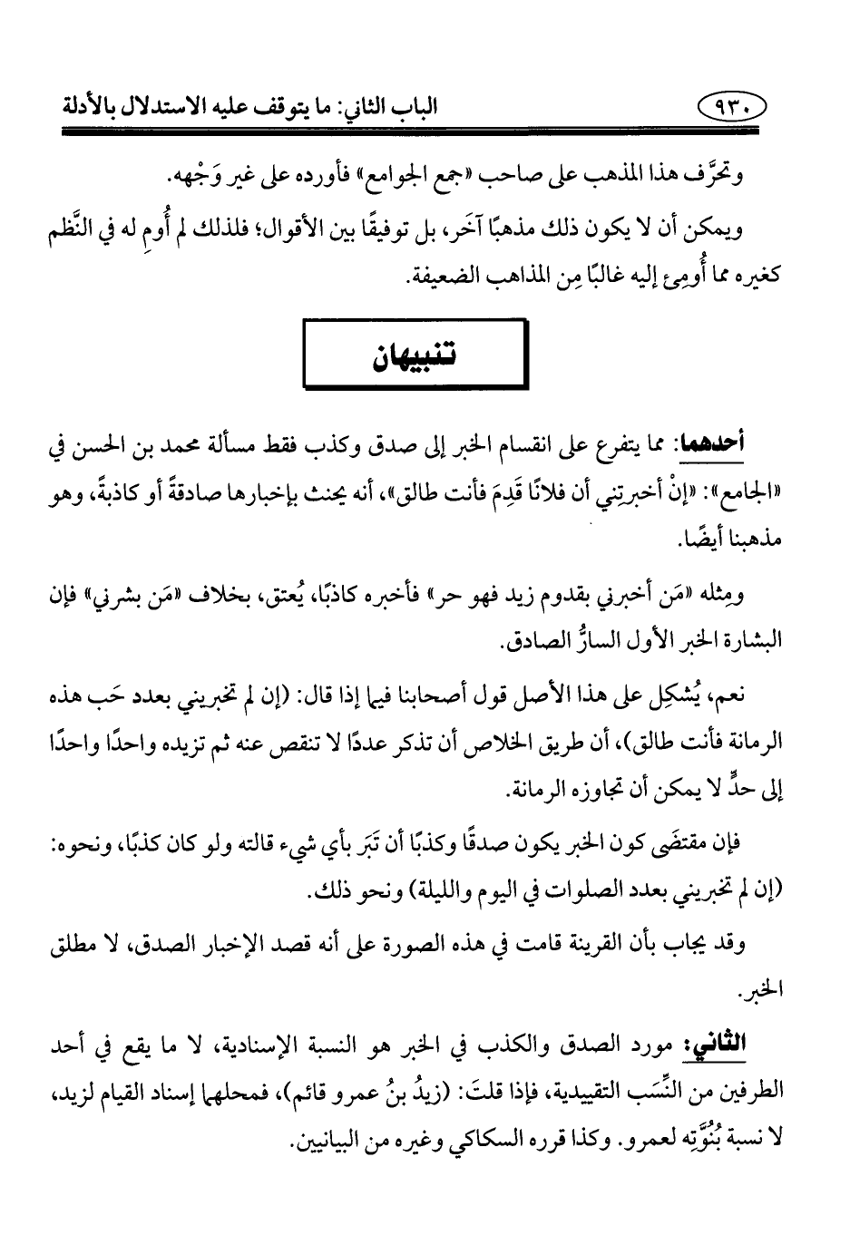 الثاني: مورد الصدق والكذب في الخبر هو النسبة الإسنادية، لا ما يقع في أحد الطرفين من النِّسَب التقييدية، فإذا قلتَ: (زيدُ بنُ عمرو قائم)، فمحلهما إسناد القيام لزيد، لا نسبة بُنُوَّتِه لعمرو. وكذا قرره السكاكي وغيره من البيانيين.