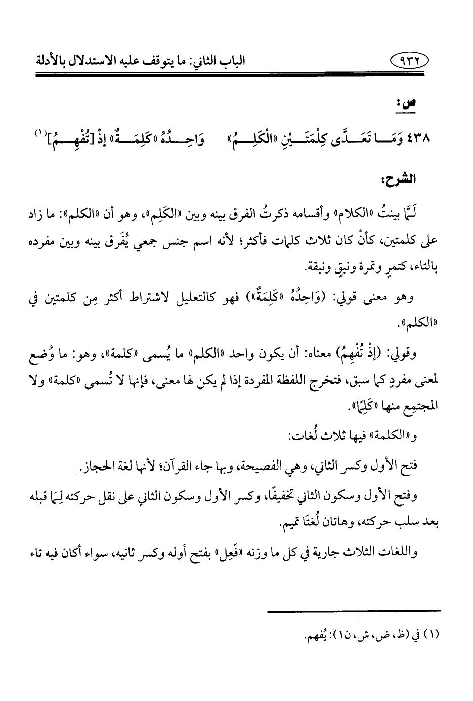 ٤٣٨ - وَمَا تَعَدَّى كِلْمَتَيْنِ "الْكَلِمُ" ... وَاحِدُهُ "كَلِمَةٌ" إذْ [تُفْهِمُ] (¬١)