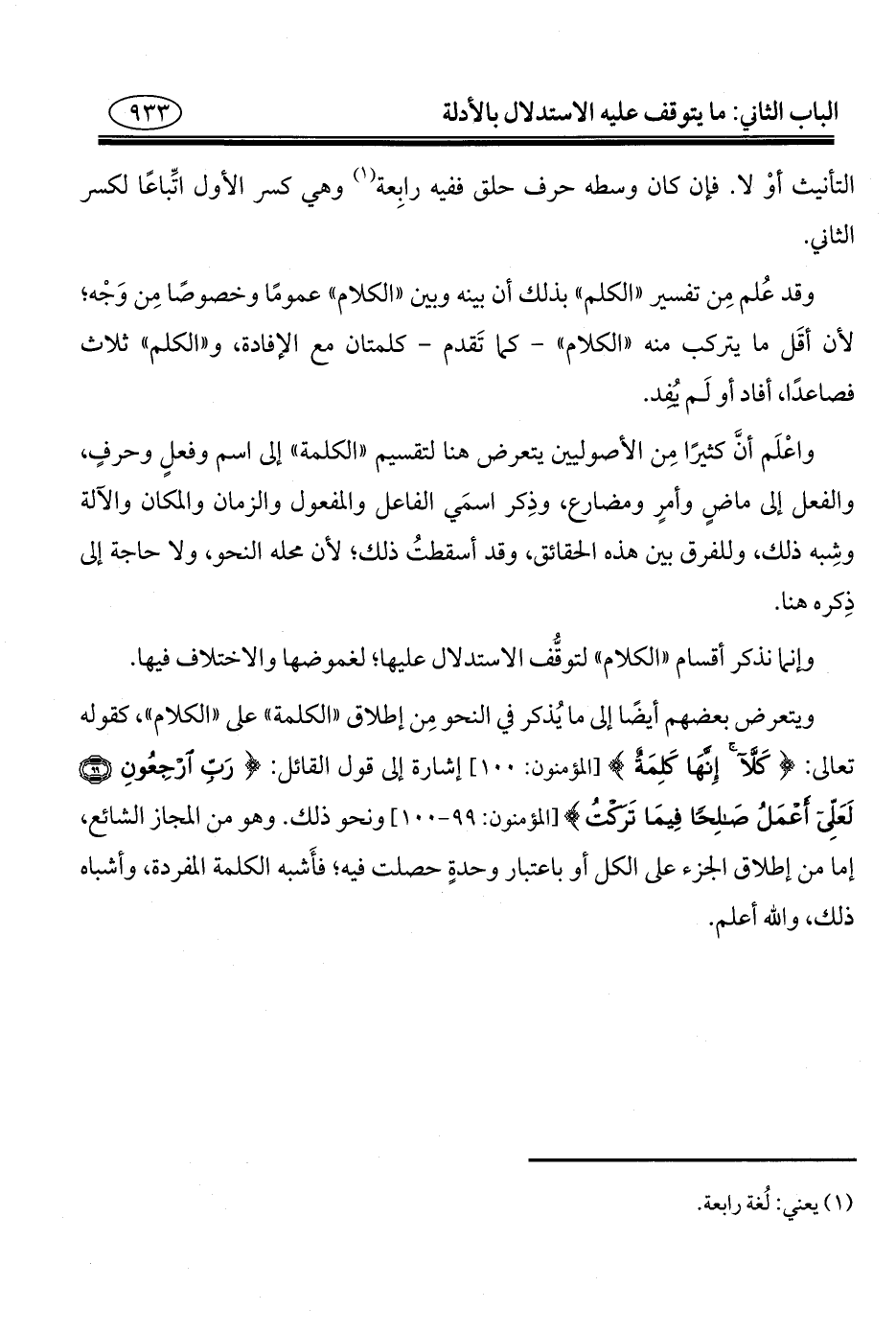 واعْلَم أنَّ كثيرًا مِن الأصوليين يتعرض هنا لتقسيم "الكلمة" إلى اسم وفعلٍ وحرفٍ، والفعل إلى ماضٍ وأمرٍ ومضارع، وذِكر اسمَي الفاعل والمفعول والزمان والمكان والآلة وشِبه ذلك، وللفرق بين هذه الحقائق، وقد أسقطتُ ذلك؛ لأن محله النحو، ولا حاجة إلى ذِكره هنا.
