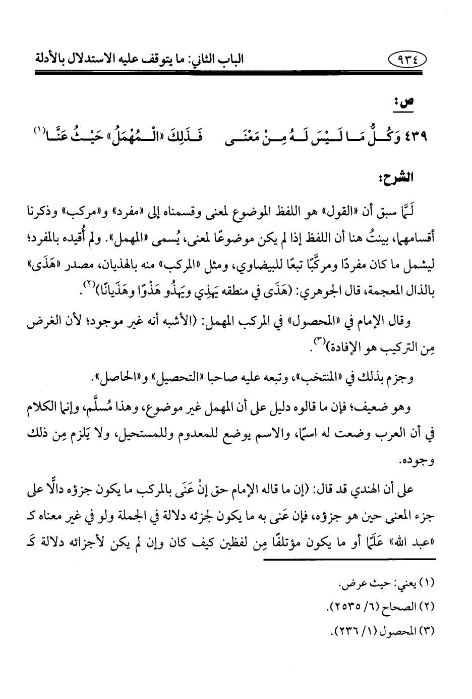 لَمَّا سبق أن "القول" هو اللفظ الموضوع لمعنى وقسمناه إلى "مفرد" و"مركب" وذكرنا أقسامهما، بينتُ هنا أن اللفظ إذا لم يكن موضوعًا لمعنى، يُسمى "المهمل". ولم أُقيده بالمفرد؛ ليشمل ما كان مفردًا ومركَّبًا تبعًا للبيضاوي، ومثل "المركب" منه بالهذيان، مصدر "هَذَى" بالذال المعجمة، قال الجوهري: (هَذَى في منطقه يَهذِي ويَهذُو هَذْوًا وهَذَيانًا) (¬٢).