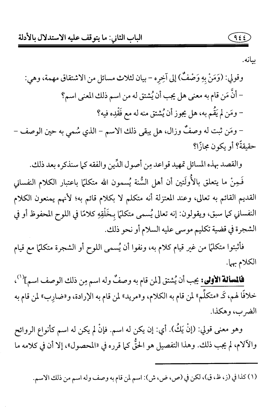 فالمسألة الأولى: يجب أن يُشتق [لمن قام به وصفٌ وله اسم مِن ذلك الوصف اسم] (¬١)، خلافًا لهم، كَـ "متكلِّم" لمن قام به الكلام، و"مريد" لمن قام به الإرادة، و"ضارِب" لمن قام به الضرب، وهكذا.