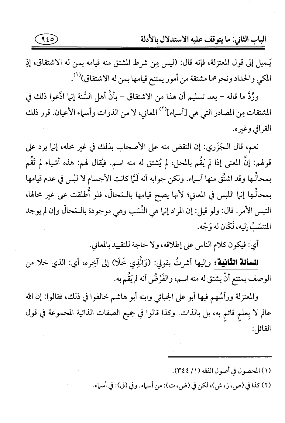 ورُدَّ ما قاله -بعد تسليم أن هذا من الاشتقاق- بأنَّ أهل السُّنة إنما ادَّعوا ذلك في المشتقات مِن المصادر التي هي [أسماء] (¬٢) المعاني، لا من الذوات وأسماء الأعيان. قرر ذلك القرافي وغيره.