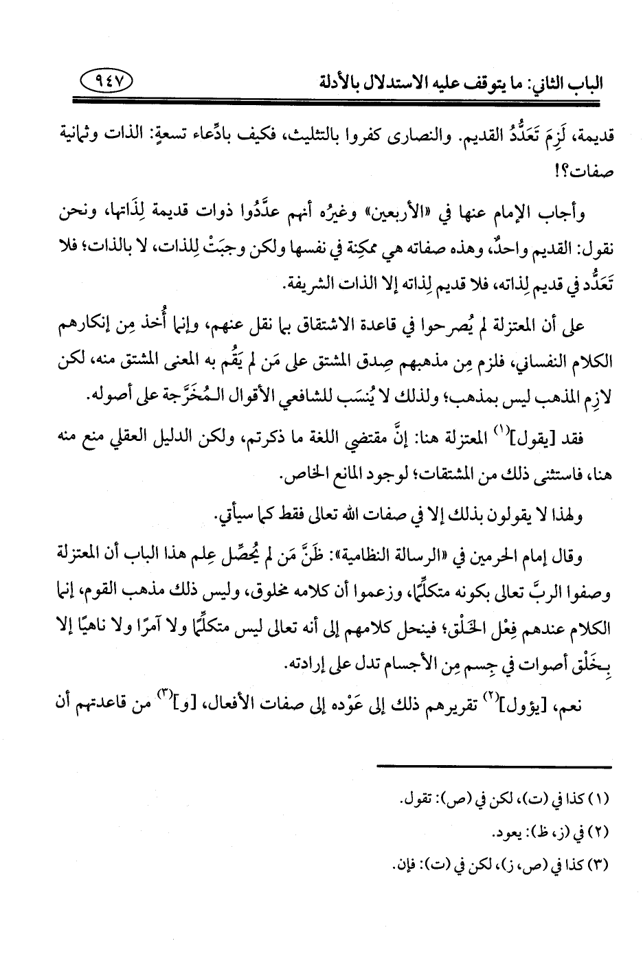 على أن المعتزلة لم يُصرحوا في قاعدة الاشتقاق بما نقل عنهم، وإنما أُخذ مِن إنكارهم الكلام النفساني، فلزم مِن مذهبهم صِدق المشتق على مَن لم يَقُم به المعنى المشتق منه، لكن لازِم المذهب ليس بمذهب؛ ولذلك لا يُنسَب للشافعي الأقوال المُخَرَّجة على أصوله.