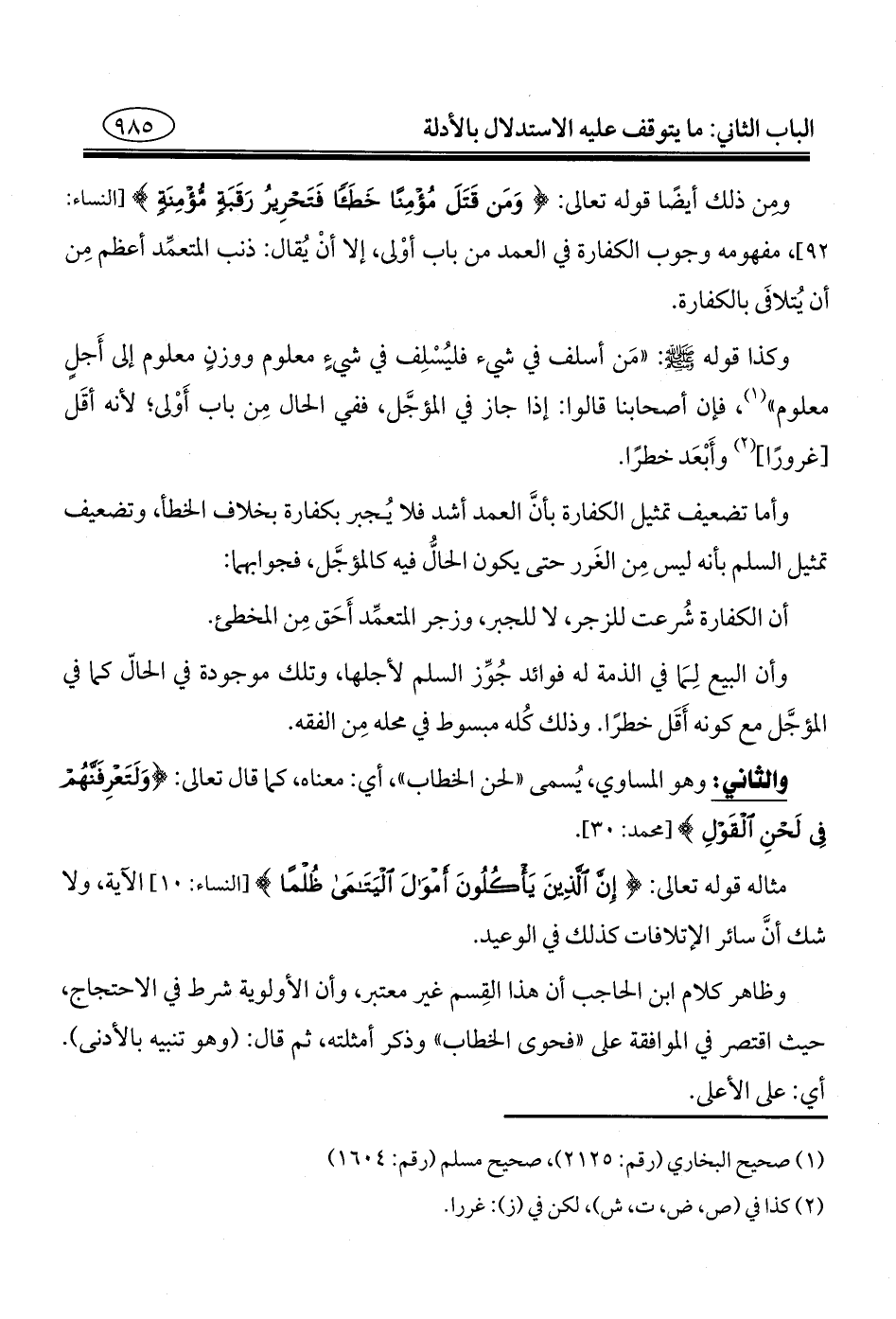 ومن ذلك أيضًا قوله تعالى: {وَمَنْ قَتَلَ مُؤْمِنًا خَطَأً فَتَحْرِيرُ رَقَبَةٍ مُؤْمِنَةٍ} [النساء: ٩٢]، مفهومه وجوب الكفارة في العمد من باب أوْلى، إلَّا أنْ يُقال: ذنب المتعمِّد أعظم مِن أن يُتلافَى بالكفارة.