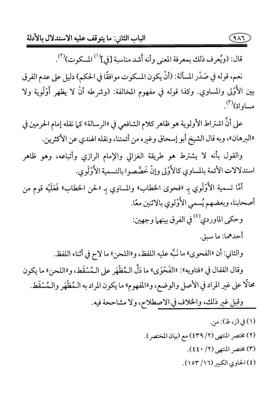 نعم، قوله في صَدْر المسألة: (أنْ يكون المسكوت موافقًا في الحكم) دليل على عدم الفرق بين الأَوْلى والمساوي. وكذا قوله في مفهوم المخالفة: (وشرطه أنْ لا يظهر أَوْلَوية ولا مساواة) (¬٣).