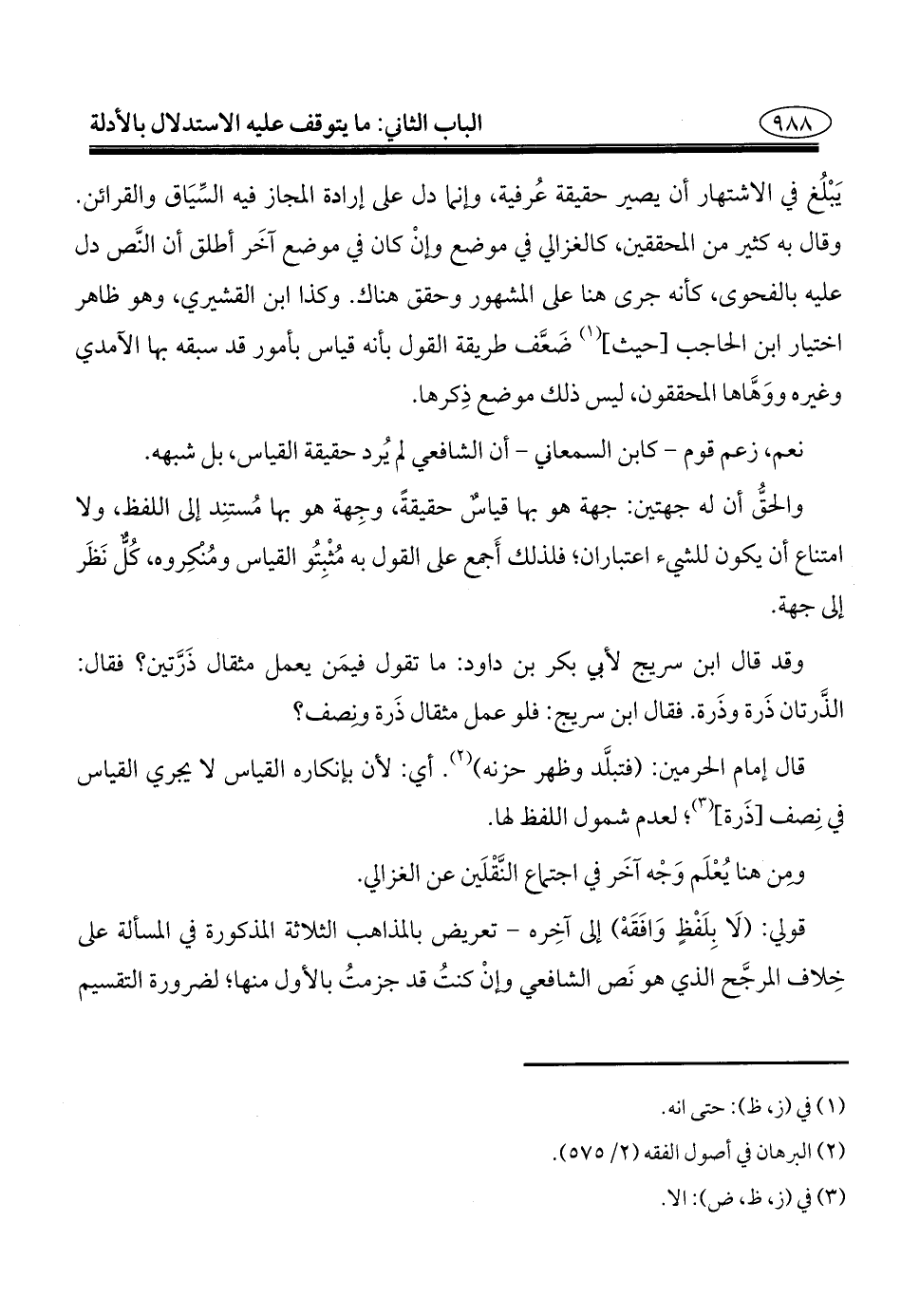 قال إمام الحرمين: (فتبلَّد وظهر حزنه) (¬٢). أي: لأن بإنكاره القياس لا يجري القياس في نِصف [ذَرة] (¬٣)، لعدم شمول اللفظ لها.
