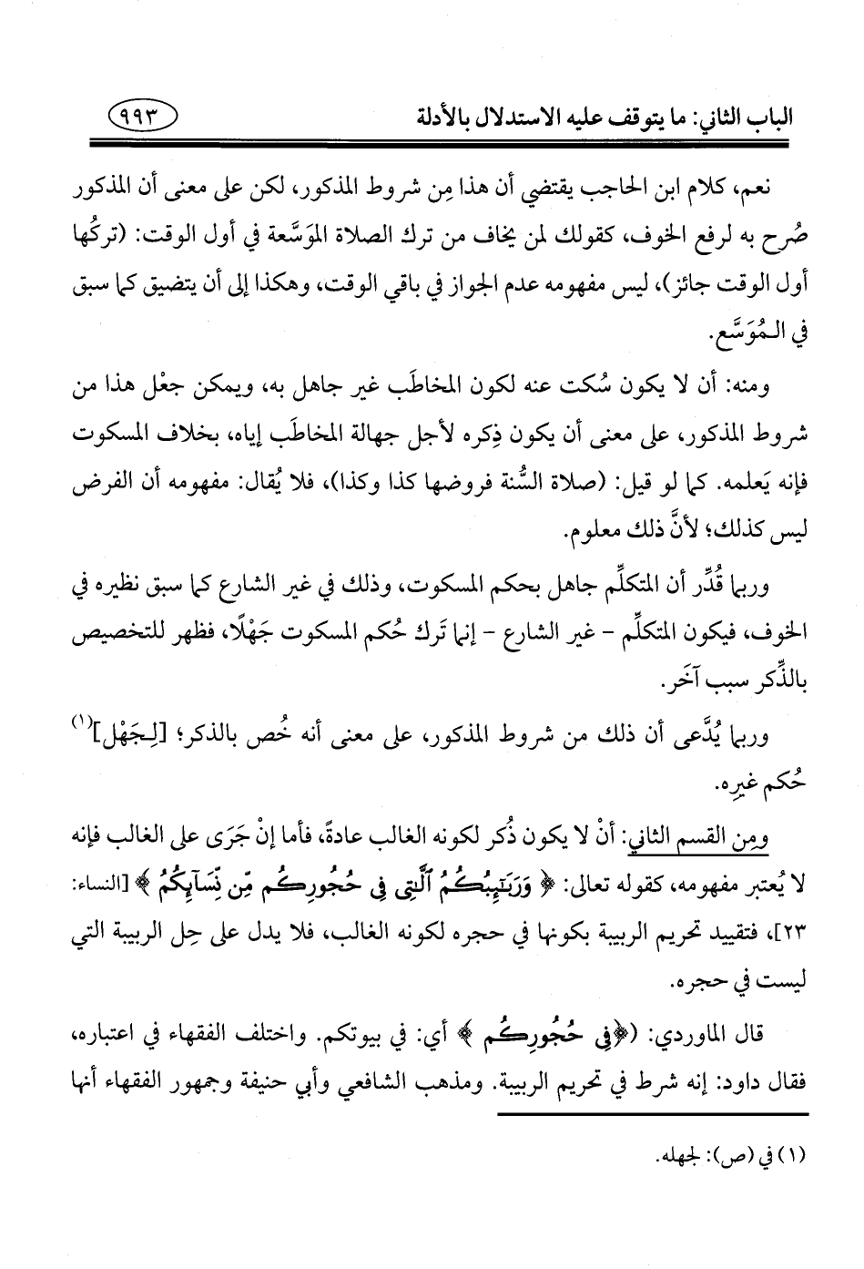ومن القسم الثاني: أنْ لا يكون ذُكر لكونه الغالب عادةً، فأما إنْ جَرَى على الغالب فإنه لا يُعتبر مفهومه، كقوله تعالى: {وَرَبَائِبُكُمُ اللَّاتِي فِي حُجُورِكُمْ مِنْ نِسَائِكُمُ} [النساء: ٢٣]، فتقييد تحريم الربيبة بكونها في حجره لكونه الغالب، فلا يدل على حِل الربيبة التي ليست في حجره.