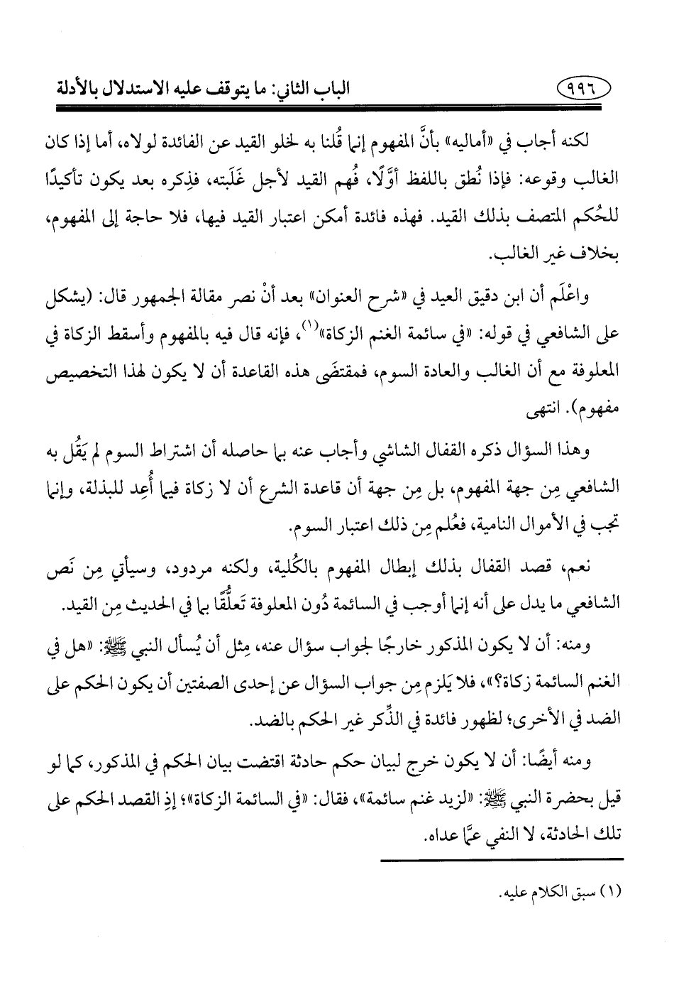 ومنه: أن لا يكون المذكور خارجًا لجواب سؤال عنه، مِثل أن يُسأل النبي - صلى الله عليه وسلم -: "هل في الغنم السائمة زكاة؟ "، فلا يَلزم مِن جواب السؤال عن إحدى الصفتين أن يكون الحكم على الضد في الأخرى؛ لظهور فائدة في الذِّكر غير الحكم بالضد.