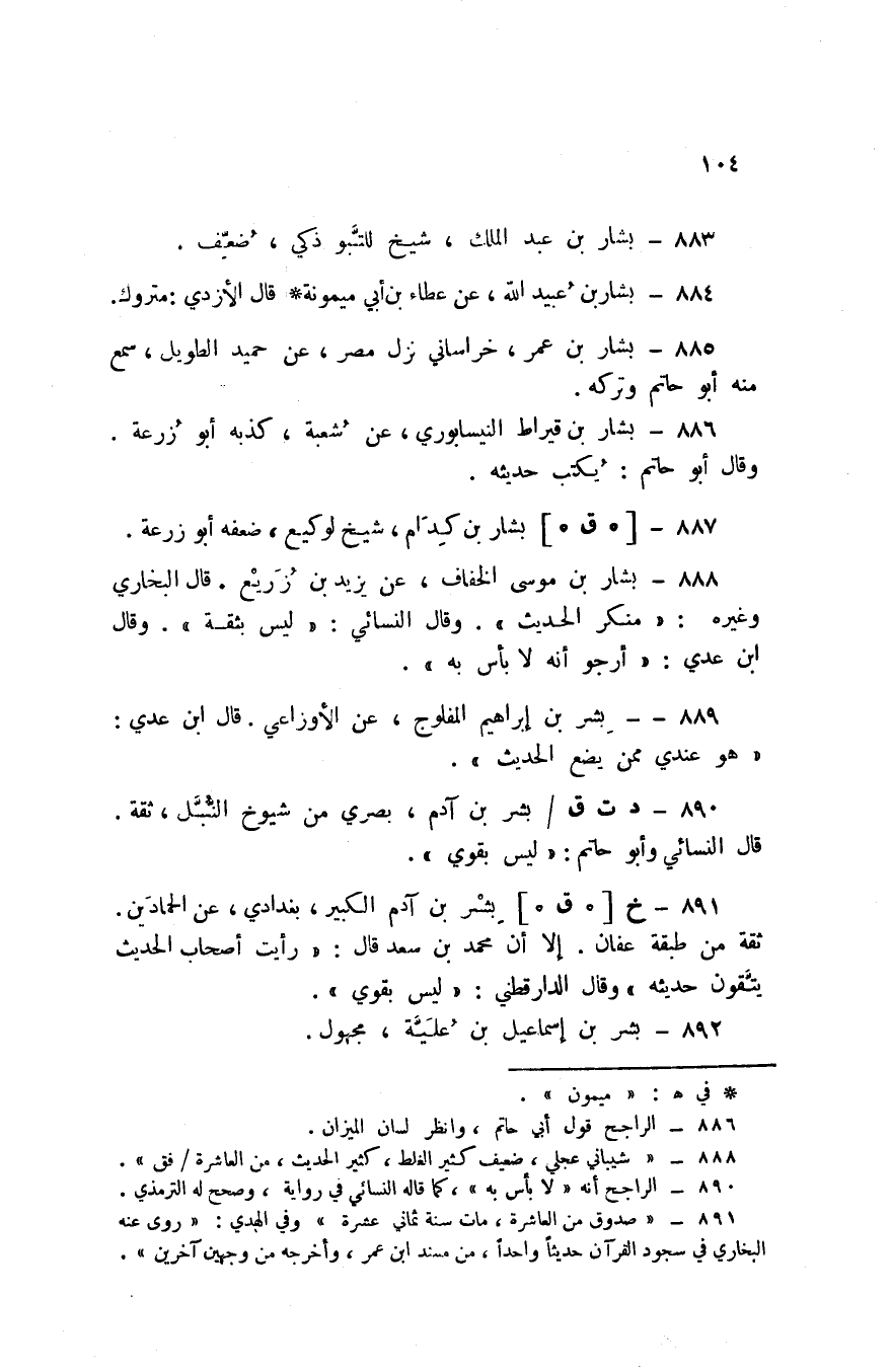 888 - بشار بن مُوسَى الْخفاف عَن يزِيد بن زُرَيْع قَالَ البُخَارِيّ وَغَيره مُنكر الحَدِيث وَقَالَ النَّسَائِيّ لَيْسَ بِثِقَة وَقَالَ ابْن عدي ارجو انه لَا بَأْس بِهِ