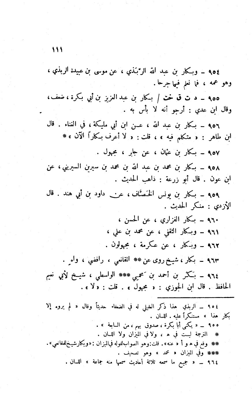958 - بكار بن مُحَمَّد بن عبد الله بن مُحَمَّد بن سِيرِين السيريني عَن ابْن عون قَالَ ابو زرْعَة ذَاهِب الحَدِيث
