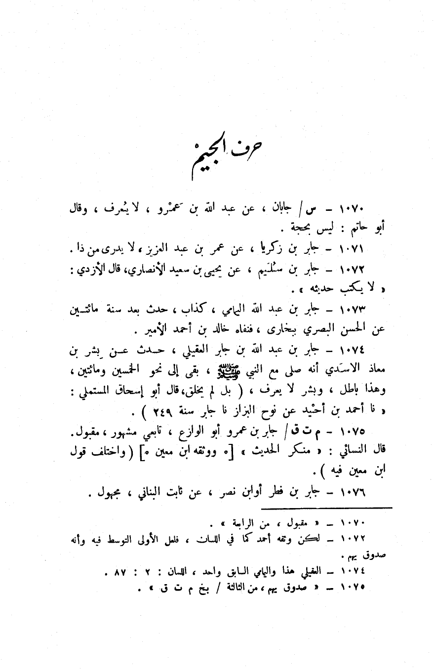 1073 - جَابر بن عبد الله اليمامي كَذَّاب حدث بعد سنه مِائَتَيْنِ عَن الْحسن الْبَصْرِيّ ببخارى فنفاه خَالِد بن أَحْمد الْأَمِير