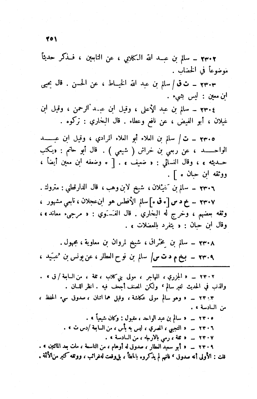 2304 - سَالم بن عبد الاعلى وَقيل ابْن عبد الرَّحْمَن وَقيل ابْن غيلَان أَبُو الْفَيْض عَن نَافِع وَعَطَاء قَالَ البُخَارِيّ تَرَكُوهُ