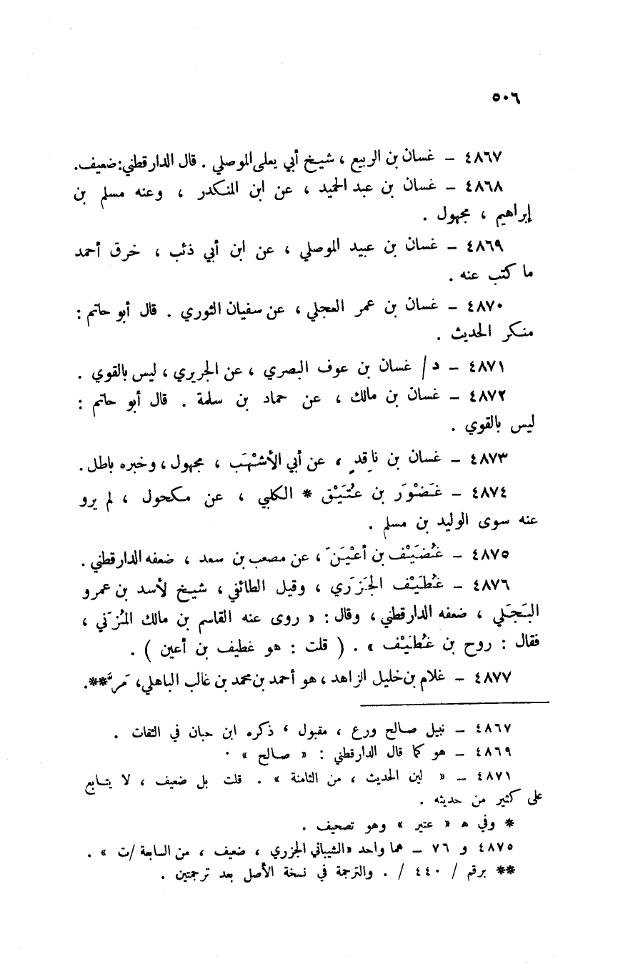 4873 - غَسَّان بن ناقد عَن أبي الْأَشْهب مَجْهُول وَخَبره بَاطِل 4874 - غضور بن عَتيق الْكَلْبِيّ عَن مَكْحُول لم يرو عَنهُ سوى الْوَلِيد بن مُسلم
