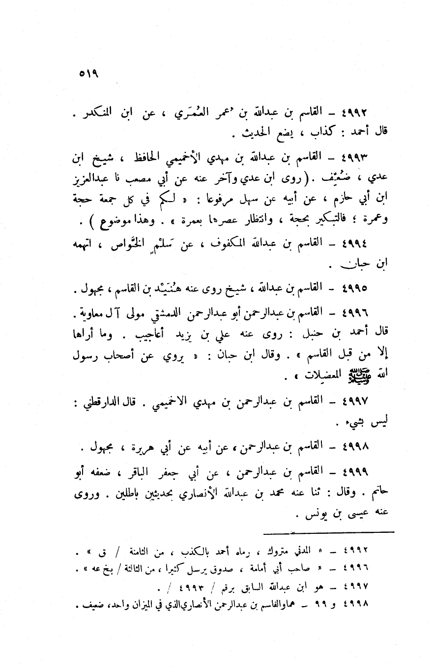 4999 - الْقَاسِم بن عبد الرحمن عَن أبي جَعْفَر الباقر ضعفه أَبُو حَاتِم وَقَالَ ثَنَا عَنهُ مُحَمَّد بن عبد الله الْأنْصَارِيّ بحديثين باطلين وروى عَنهُ عِيسَى بن يُونُس