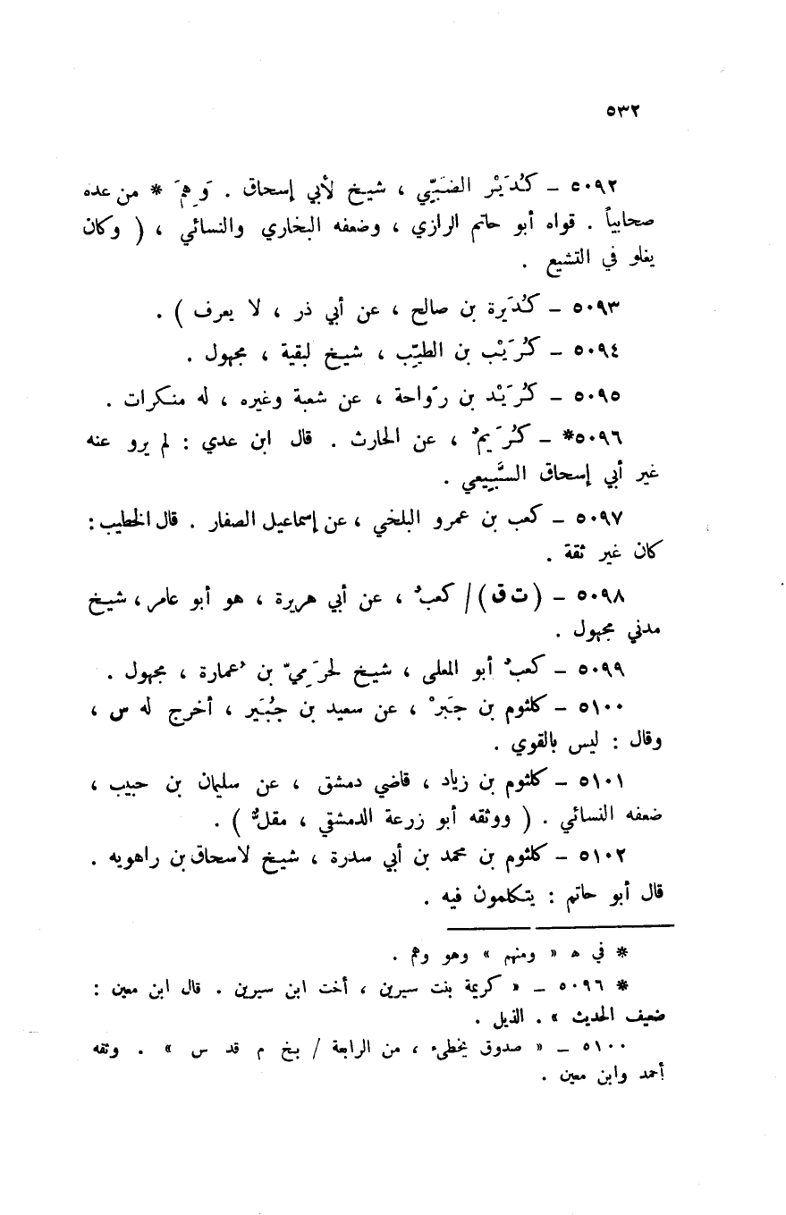 5092 - كدير الضَّبِّيّ شيخ لأبي إِسْحَاق وهم من عده صحابيا قواه أَبُو حَاتِم الرَّازِيّ وَضَعفه البُخَارِيّ وَالنَّسَائِيّ وَكَانَ يغلو فِي التَّشَيُّع