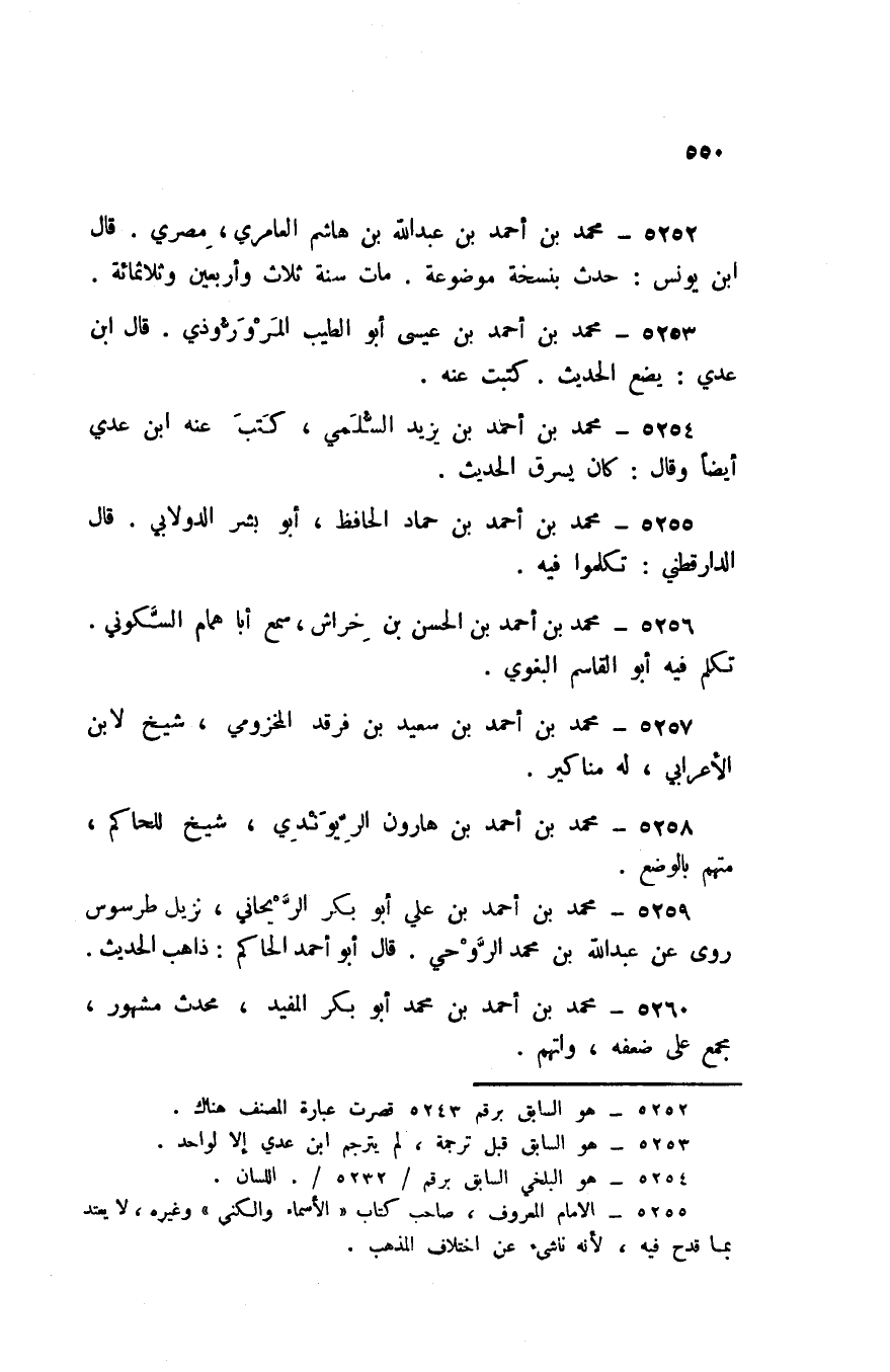 5252 - مُحَمَّد بن أَحْمد بن عبد الله بن هَاشم العامري مصري قَالَ ابْن يُونُس حدث بنسخة مَوْضُوعَة مَاتَ سنة ثَلَاث وَأَرْبَعين وثلاثمائة