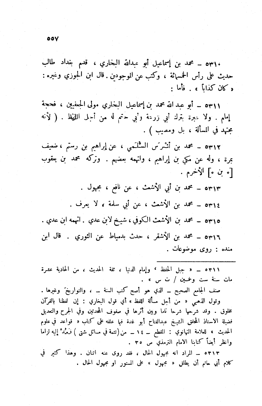 5311 - أَبُو عبد الله مُحَمَّد بن إِسْمَاعِيل البُخَارِيّ مولى الجعفيين فحجة إِمَام وَلَا عِبْرَة بترك أبي زرْعَة وَأبي حَاتِم لَهُ من أجل اللَّفْظ لِأَنَّهُ مُجْتَهد فِي الْمَسْأَلَة بل ومصيب
