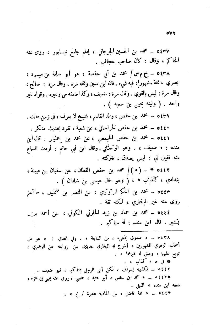 5441 - مُحَمَّد بن حَفْص الْحِمصِي عَن مُحَمَّد بن حمير قَالَ ابْن مَنْدَه ضَعِيف وَهُوَ الوصابي وَقَالَ ابْن أبي حَاتِم أردْت السماع مِنْهُ فَقيل لي لَيْسَ يصدق فتركته