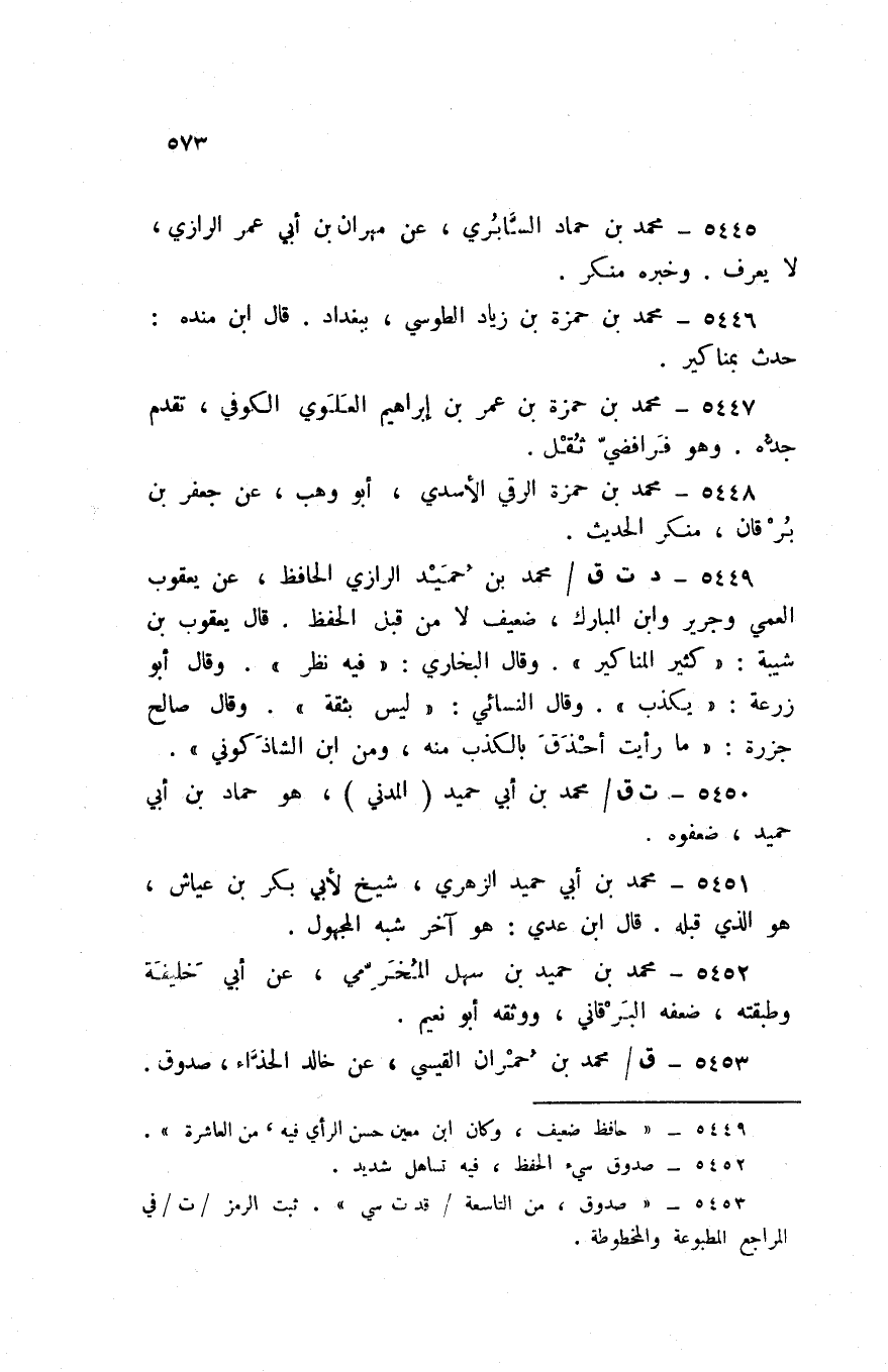 5449 - د ت ق / مُحَمَّد بن حميد الرَّازِيّ الْحَافِظ عَن يَعْقُوب الْعمي وَجَرِير وَابْن الْمُبَارك ضَعِيف لَا من قبل الْحِفْظ قَالَ يَعْقُوب بن شيبَة كثير الْمَنَاكِير وَقَالَ البُخَارِيّ فِيهِ نظر وَقَالَ ابو زرْعَة يكذب وَقَالَ النَّسَائِيّ لَيْسَ بِثِقَة وَقَالَ صَالح جزرة مَا رَأَيْت أحذق بِالْكَذِبِ مِنْهُ وَمن ابْن الشَّاذكُونِي