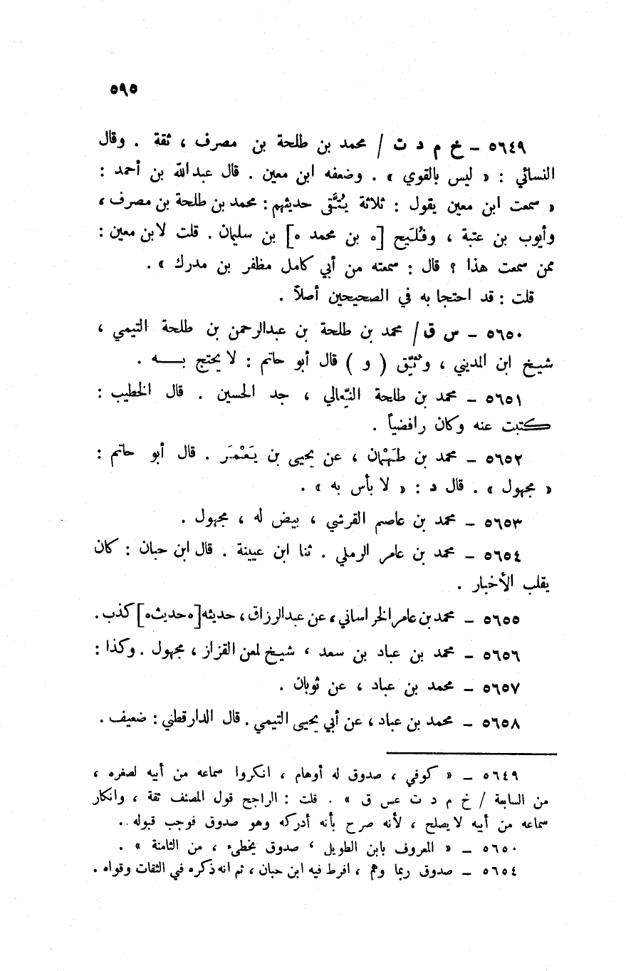 5650 - س ق / مُحَمَّد بن طَلْحَة بن عبد الرَّحْمَن بن طَلْحَة التَّيْمِيّ شيخ ابْن الْمَدِينِيّ وثق وَقَالَ أَبُو حَاتِم لَا يحْتَج بِهِ