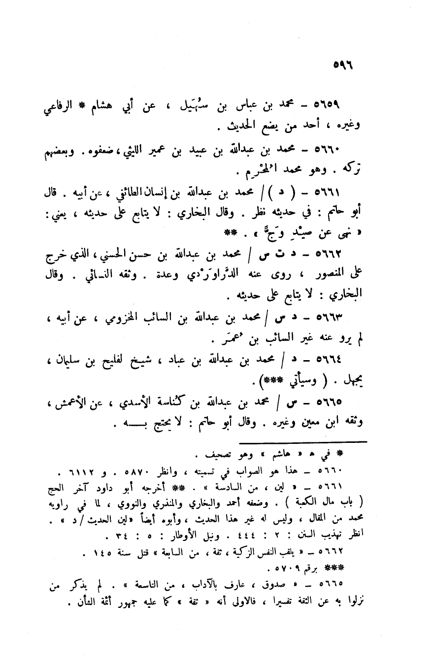 5662 - د ت س / مُحَمَّد بن عبد الله بن حسن الحسني الَّذِي خرج على الْمَنْصُور روى عَنهُ الدَّرَاورْدِي وعدة وَثَّقَهُ النَّسَائِيّ وَقَالَ البُخَارِيّ لَا يُتَابع على حَدِيثه