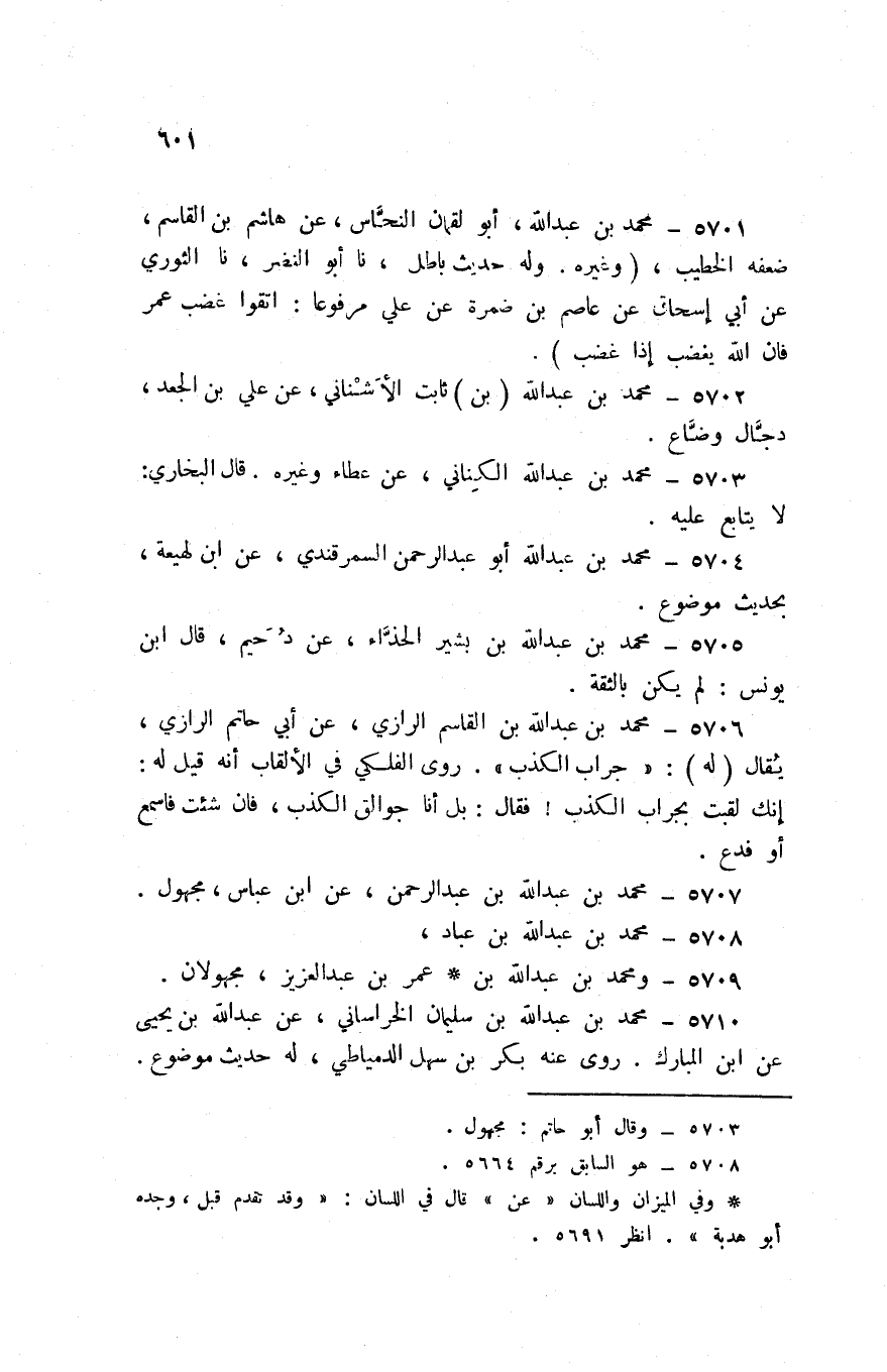 5710 - مُحَمَّد بن عبد الله بن سُلَيْمَان الْخُرَاسَانِي عَن عبد الله بن يحيى عَن ابْن الْمُبَارك روى عَنهُ بكر بن سهل الدمياطي لَهُ حَدِيث مَوْضُوع