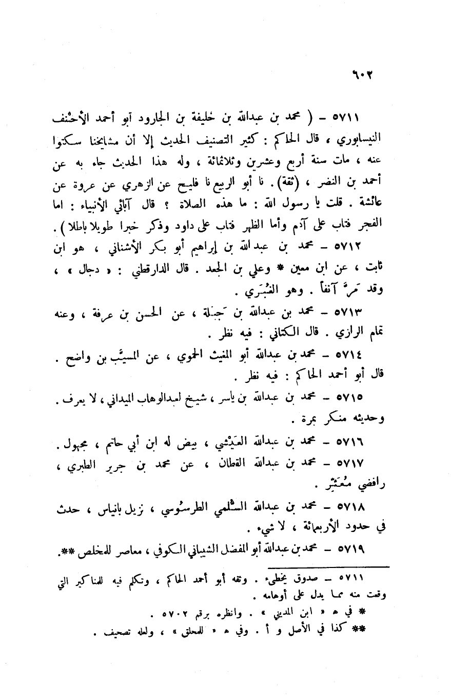 5711 - مُحَمَّد بن عبد الله بن خَليفَة بن الْجَارُود أَبُو أَحْمد الْأَحْنَف النَّيْسَابُورِي قَالَ الْحَاكِم كثير التصنيف الحَدِيث إِلَّا أَن مَشَايِخنَا سكتوا عَنهُ مَاتَ سنة أَربع وَعشْرين وثلاثمائة وَله هَذَا الحَدِيث جَاءَ بِهِ عَن أَحْمد بن النَّضر ثِقَة نَا أَبُو الرّبيع نَا فليح عَن الزُّهْرِيّ عَن عُرْوَة عَن عَائِشَة قلت يَا رَسُول الله مَا هَذِه الصَّلَاة قَالَ آبَائِي الْأَنْبِيَاء أما الْفجْر فَتَابَ على آدم وَأما الظّهْر فَتَابَ على دَاوُد وَذكر خَبرا طَويلا بَاطِلا