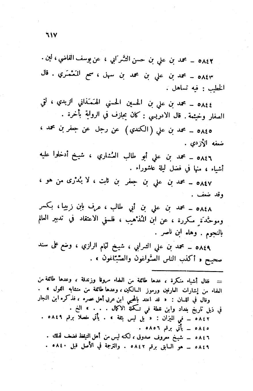 5844 - مُحَمَّد بن عَليّ بن الحسني الهمذاني الزيدي لَقِي الصفار وخيثمة قَالَ الادريسي كَانَ يجازف فِي الرِّوَايَة بِأخرَة