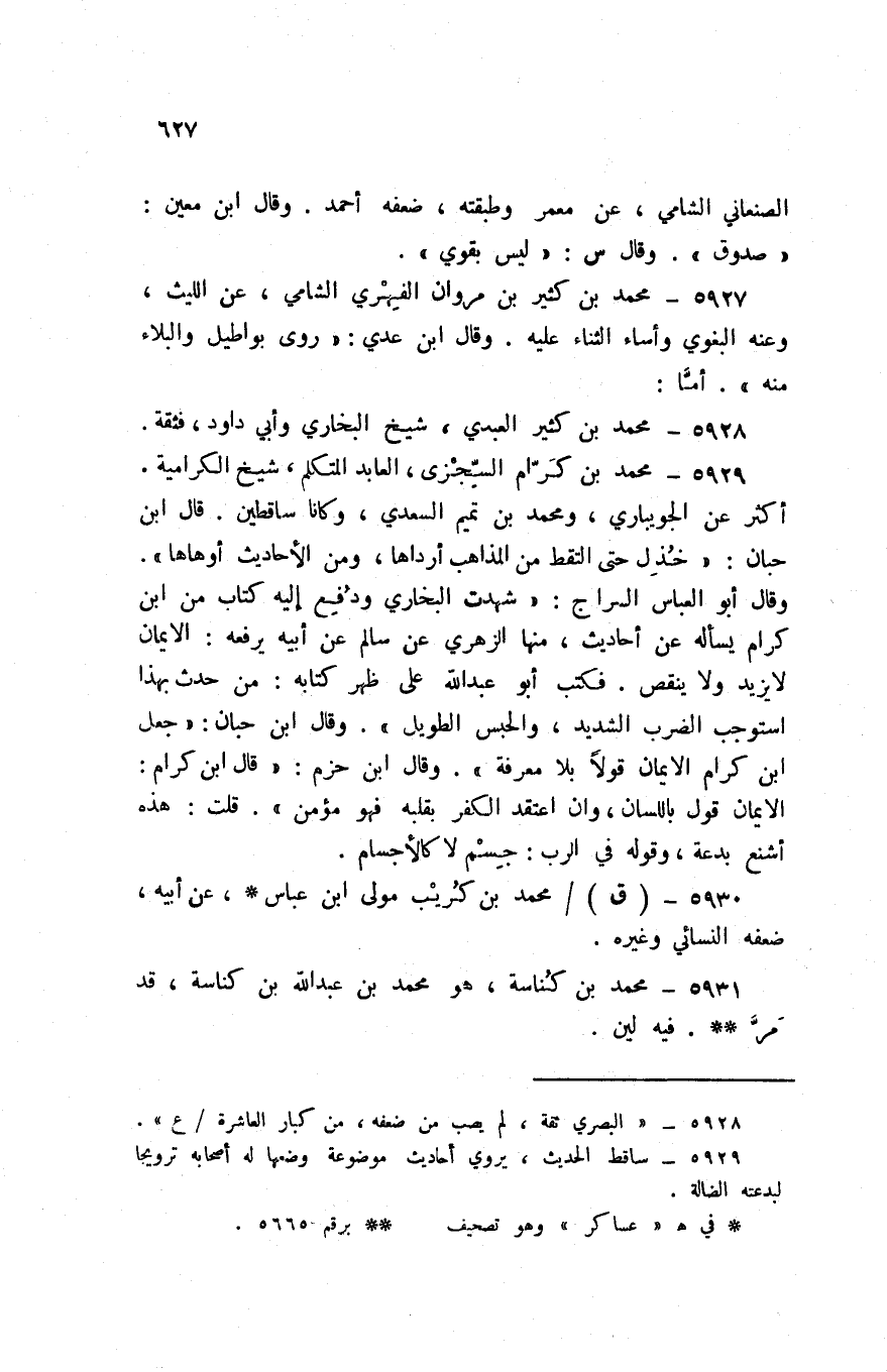 5929 - مُحَمَّد بن كرام السيجزى العابد الْمُتَكَلّم شيخ الكرامية أَكثر عَن الجويباري وَمُحَمّد بن تَمِيم السَّعْدِيّ وَكَانَا ساقطين قَالَ ابْن حبَان خذل حَتَّى الْتقط من الْمذَاهب أَرْدَاهَا وَمن الْأَحَادِيث أوهاها وَقَالَ أَبُو الْعَبَّاس السراج شهِدت البُخَارِيّ وَدفع إِلَيْهِ كتاب من ابْن كرام يسْأَله عَن أَحَادِيث مِنْهَا الزُّهْرِيّ عَن سَالم عَن أَبِيه يرفعهُ الايمان لَا يزِيد وَلَا ينقص فَكتب أَبُو عبد الله عل ظهر كِتَابه من حدث بِهَذَا اسْتوْجبَ الضَّرْب الشَّديد وَالْحَبْس الطَّوِيل وَقَالَ ابْن حبَان جعل ابْن كرام الايمان قولا بِلَا معرفَة وَقَالَ ابْن حزم قَالَ ابْن كرام