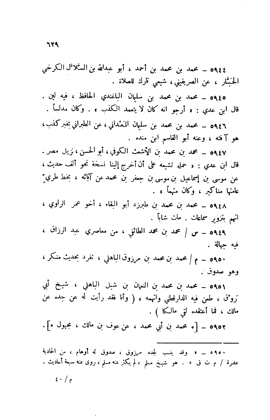 5951 - مُحَمَّد بن مُحَمَّد بن النُّعْمَان بن شبْل الْبَاهِلِيّ شيخ أبي روق طعن فِيهِ الدَّارَقُطْنِيّ واتهمه وَأَنا فقد رَأَيْت لَهُ عَن جده عَن مَالك فَمَا أعتقده لَقِي مَالِكًا